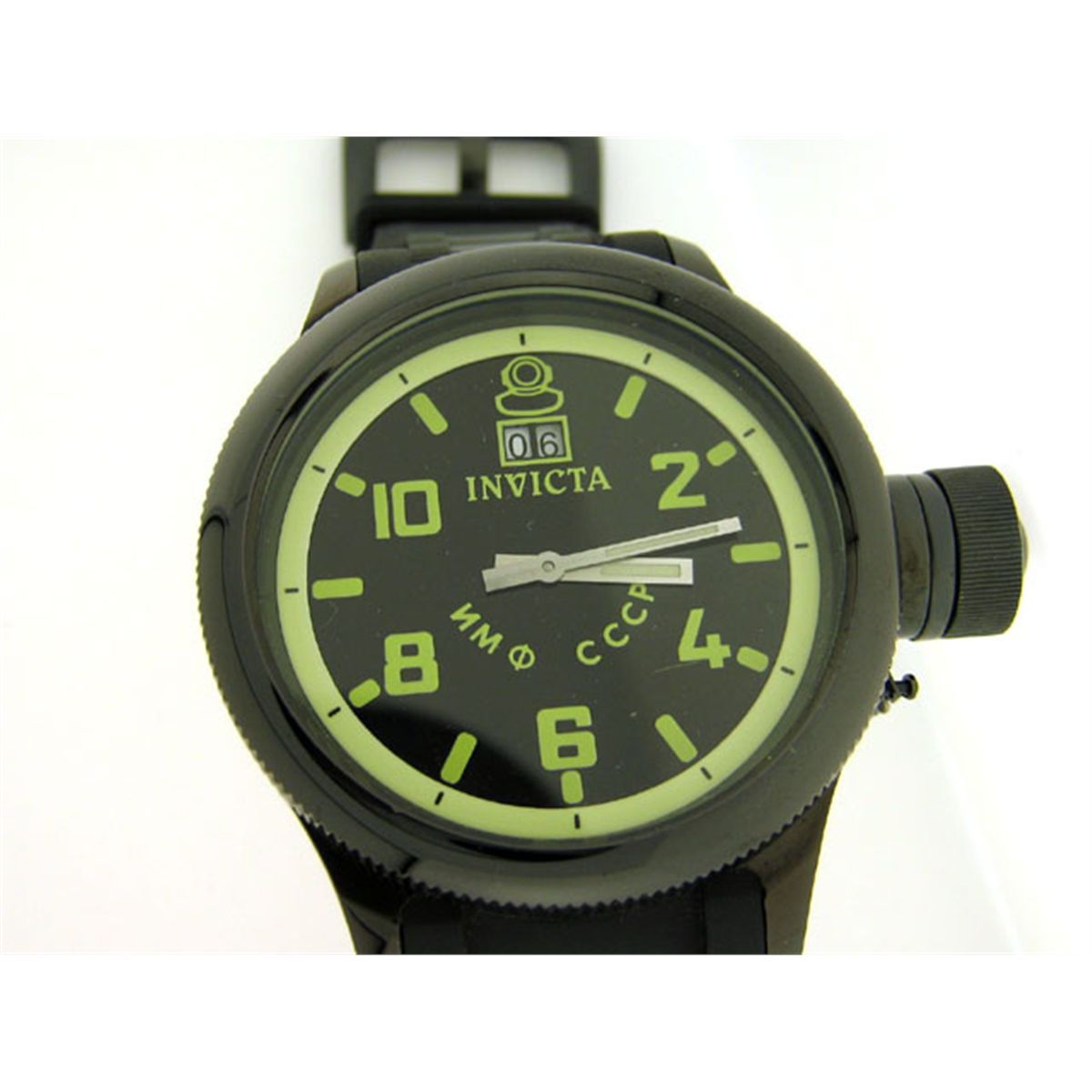 This is an Invicta Men's 4338 Russian Diver Collection Black Watch with the following features: black timepiece done in a canteen style with a screw-cap crown and chain; luminous hands and indexes; adjustable buckle; large Arabic numbers; date display just under 12 o'clock; 52 millimeter stainless steel case; black dial with the notable Russian Diver logo in place of 12 o'clock; Water resistant to 330 feet; 16 millimeters Case Thickness; and 25 millimeters Band width.