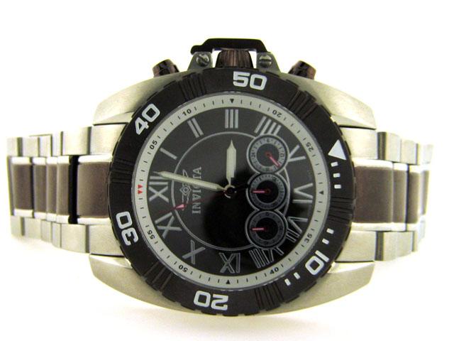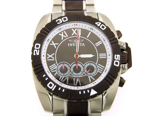 The Invicta Men's S1 Collection Rally Chronograph Watch with the following features: brown-ionic-plating-and-stainless-steel case; unidirectional brown-ionic-plating-stainless-steel bezel; two-tone-ionic-plating-stainless-steel link bracelet with a secure fold-over safety clasp; sapphire window; brown dial face; silver-tone Roman numeral hour indexes and three chronograph subdials with vibrant red hands; Japanese-quartz; and water resistant to a depth of 330 feet.