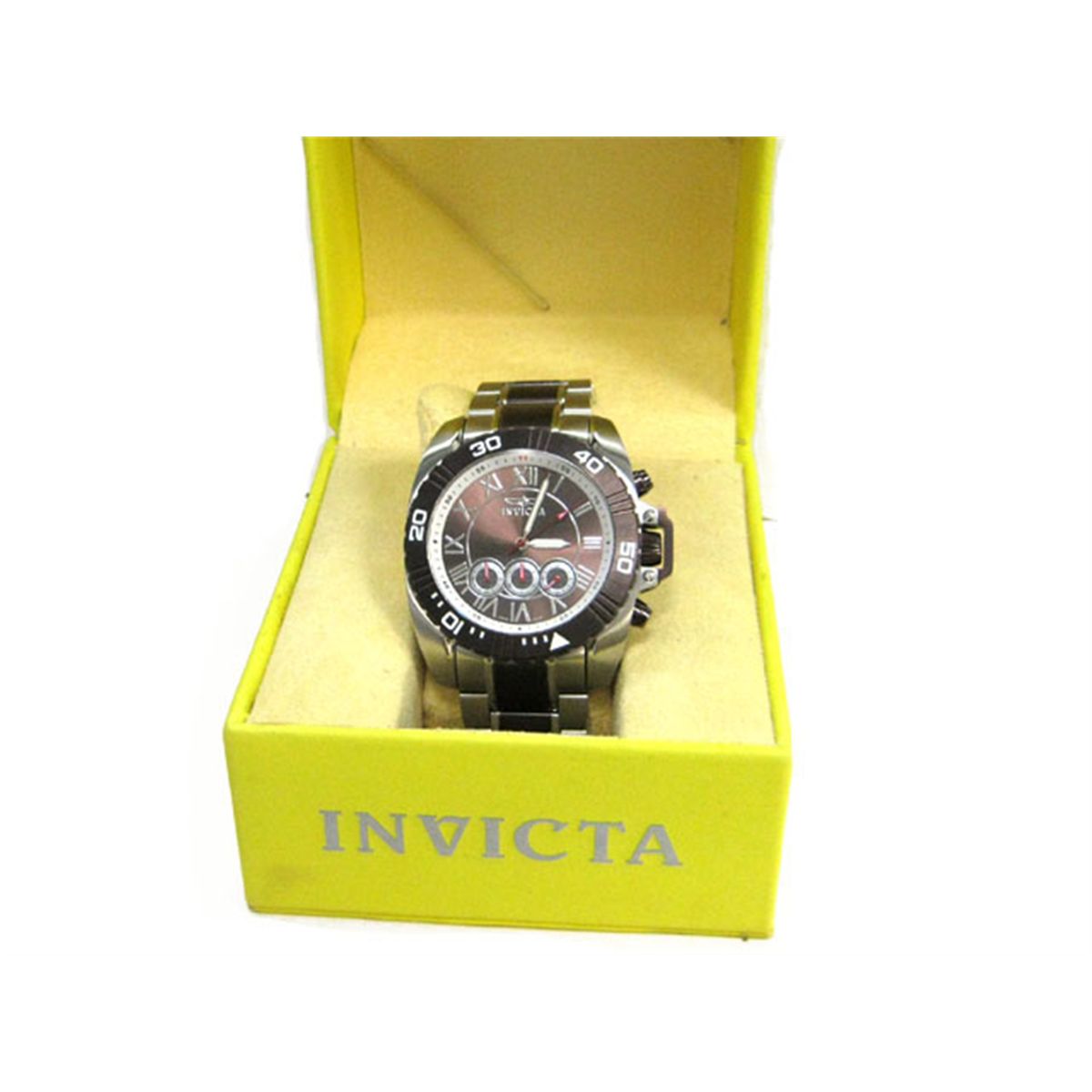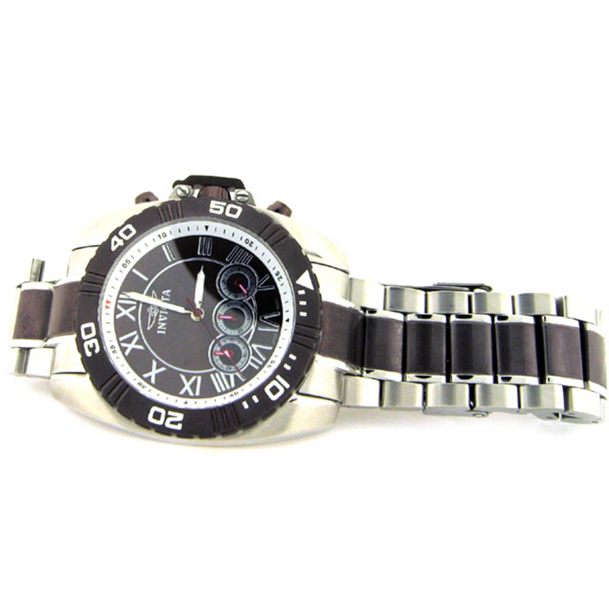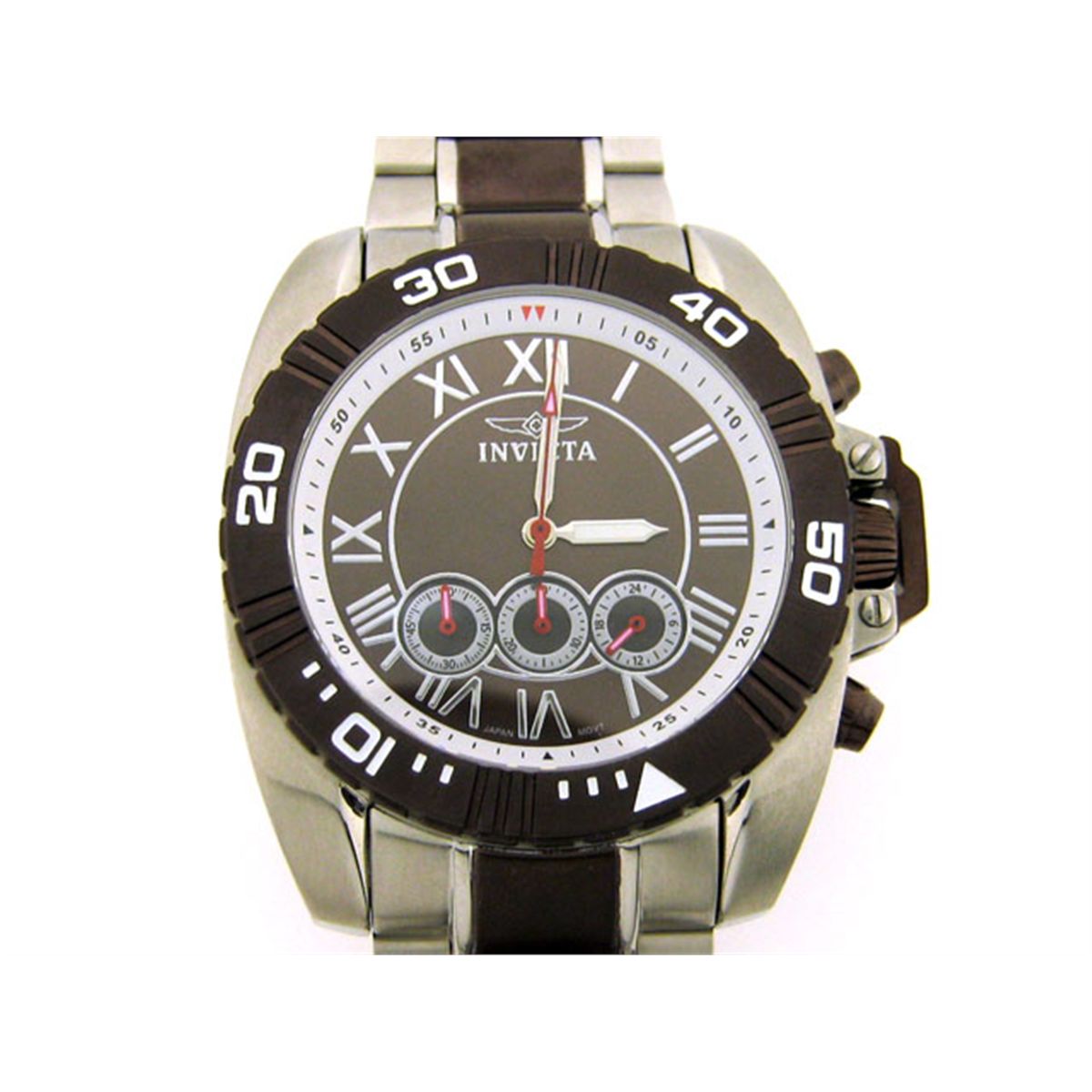 The Invicta Men's S1 Collection Rally Chronograph Watch with the following features: brown-ionic-plating-and-stainless-steel case; unidirectional brown-ionic-plating-stainless-steel bezel; two-tone-ionic-plating-stainless-steel link bracelet with a secure fold-over safety clasp; sapphire window; brown dial face; silver-tone Roman numeral hour indexes and three chronograph subdials with vibrant red hands; Japanese-quartz; and water resistant to a depth of 330 feet.