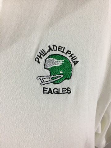 Invincible (2006) - white polo shirt, with "Philadelphia Eagles" written over top left breast, surrounding a green Eagles helmet. Olive green trousers, pleated, 100% polyester. (L)