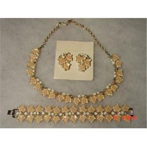 Here is an extremely RARE Signed BSK Necklace, bracelet and earrings parure! It is FRUIT SALAD Lucite or I also believe called invisible, aurora borealis rhinestones and enameled leaves set. I looked in the Costume jewelry book and found a trifari fruit salad brooch and earrings priced at 1400.00-1600.00. The fruit salad is extremely rare and very collectible! This set is also signed, and on the original card, never been worn. Not only does this just have the wonderful light pink lucite fruit salad type leaves, but also aurora borealis stones and enamel. The necklace measures 17 inches and has an adjustible chain so that it could be worn higher as a choker or lower in the neckline. The bracelet measures 7 3/4 inches. The earrings are on the original card and on the back it says F.W Woolworth co .97 cents.!! Very kool rare find, in brand new condition! One of a kind, I have never seen anything in the BSK line even close to the beauty of this set!