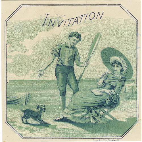<B><I>Invitation</B></I></B></I><B> Sample Cigar Label by Johns & Co., Cleveland, Ohio.</B></I> An early one-color lithographed 4.25" x 4.25" outer label. Depicted is a charming scene of courtship on the beach wherein a young fellow with an oar invites a heavily draped 1880s damsel out for a boat ride. A dog eerily similar to the canine rascal found in twentieth century "Coppertone" ads accompanies the budding couple. Mint condition.<BR><BR><b>Shipping:</b> Small Flat (<a target="_blank" href="http://www.heritageauctions.com/common/shipping.php">view shipping information</a>)