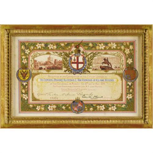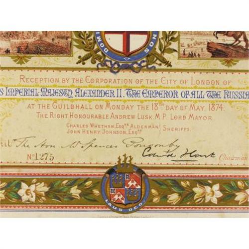 <B>Original Invitation for a Reception to Honor Grand Duke Alexander Nikolaevich, Future Tsar Alexander II of Russia</B></I><BR><BR>Printed invitation for a reception honoring the Grand Duke eleven years prior to his reign, (r. 1885-1881), at Guild Hall, on May 18, 1874, from the Honorable W. Spencer Ponsonby, signed by Edward Hart, framed, 9 x 12 in.<BR><BR>Provenance:<BR>Purchased from an autograph show, New York<BR><BR><b>Shipping:</b> Requires 3rd Party Shipping (<a target="_blank" href="http://www.heritageauctions.com/common/shipping.php">view shipping information</a>)