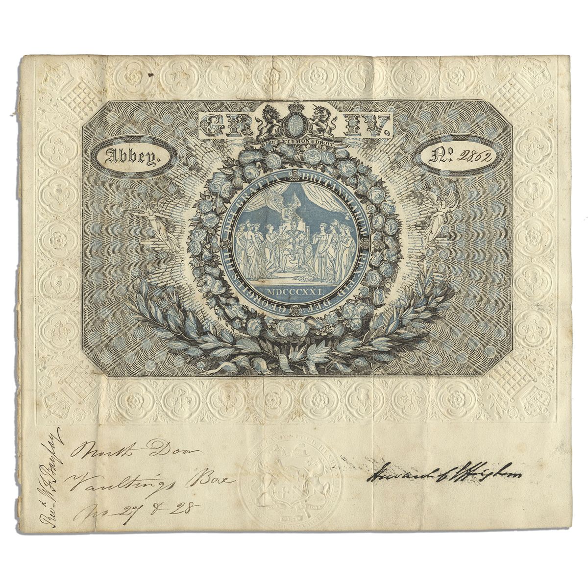 Invitation to King George IV's coronation ceremony, held 19 July 1821 at Westminster Abbey. George had already been serving as Prince Regent in his father's stead for a decade before he was ultimately crowned King himself. Invitation, numbered 2862 is to the ''Hall'' rather than the ''Abbey'' as seen on some invitations. Features an etched vignette in black and blue surrounded by an embossed border featuring a design of thistles, shamrocks and Tudor Rose. Invitation is addressed by hand at lower left to one Rev. WF Bayley, North Door Vaultings Box No. 27 & 28. Signed on the border, ''Howard Higham''. Measures 10.5'' x 9''. Page features an integral blank. Light soiling and separation to folds along the bottom edge, else near fine given age.