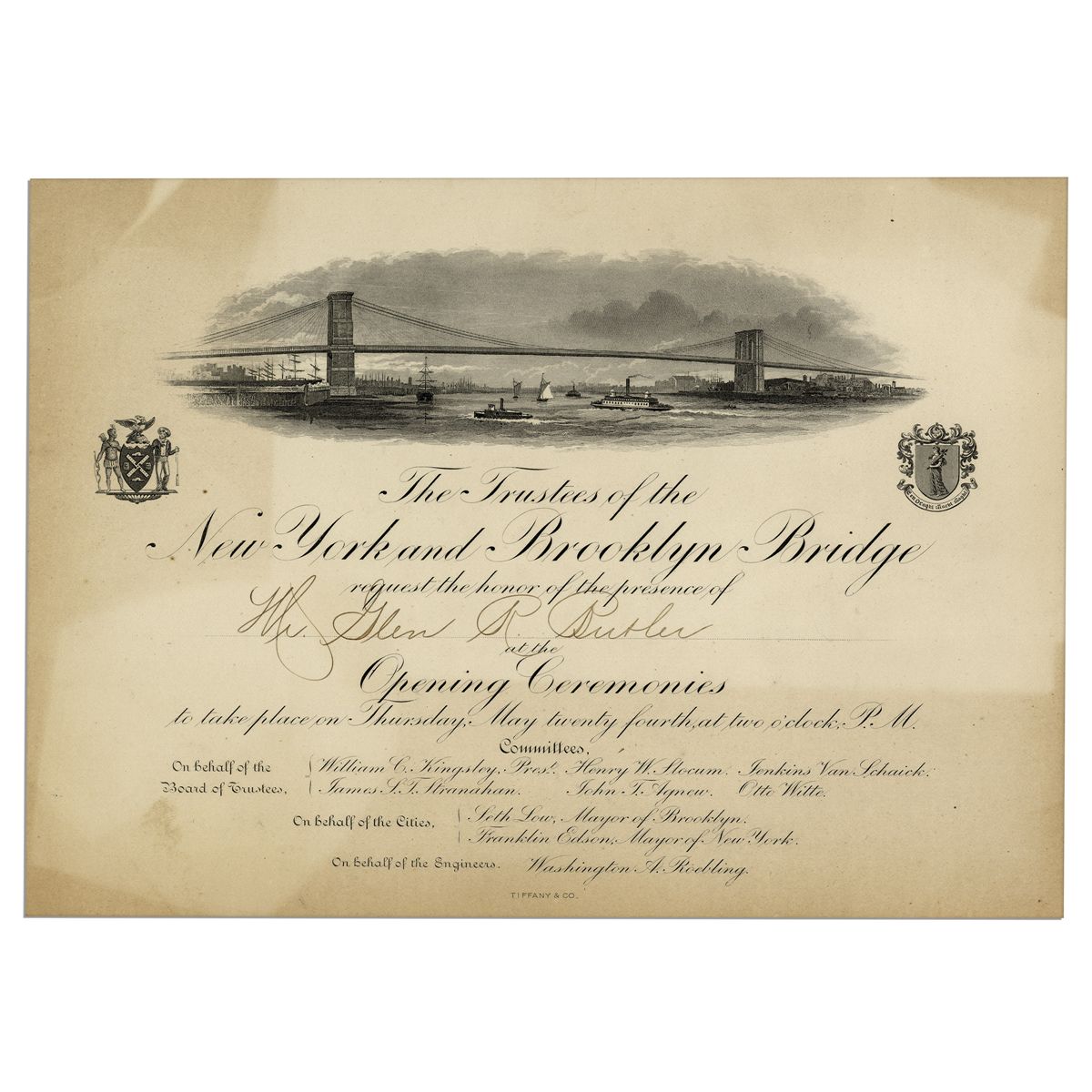 Brooklyn Bridge opening ceremony invitation. Partially-printed invitation to the 24 May 1883 celebration features a picture of the fabulous engineering achievement and reads in part, ''...The trustees of the New York and Brooklyn Bridge request the honor of the presence of [inscribed] Mr. Glen R. Butler at the opening ceremonies...'' The focal point of the card is an etching of the suspension bridge stretching across the East River to connect Manhattan and Brooklyn. Invitation was produced by Tiffany & Co., who revised the Great Seal of the United States two years later. Measures 9'' x 6.5''. Toning and evidence of mounting to verso, else near fine.