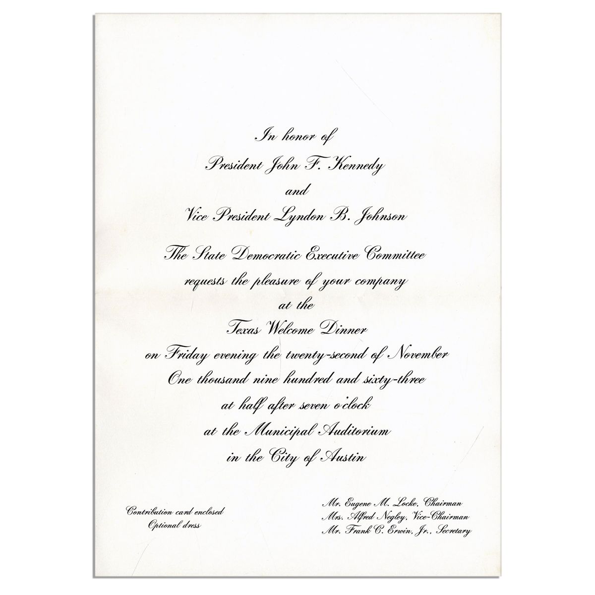 Original invitation to the dinner welcoming John F. Kennedy and Lyndon B. Johnson to Texas the fateful night of 22 November 1963. The formal print reads in full: ''In honor of President John F. Kennedy and Lyndon B. Johnson The State Democratic Executive Committee requests the pleasure of your company at the Texas Welcome Dinner on Friday evening the twenty-second of November One thousand nine hundred and sixty-three at half after seven o'clock at the Municipal Auditorium in the City of Austin''. Signed in print by the Chairman, Vice-Chairman, and Secretary. Fine print to the lower left reads: ''Contribution card enclosed / Optional dress''. Single-fold stationery measures 7'' x 9.75''. Verso shows the faintest foxing and a small stain. In very good to near fine condition.