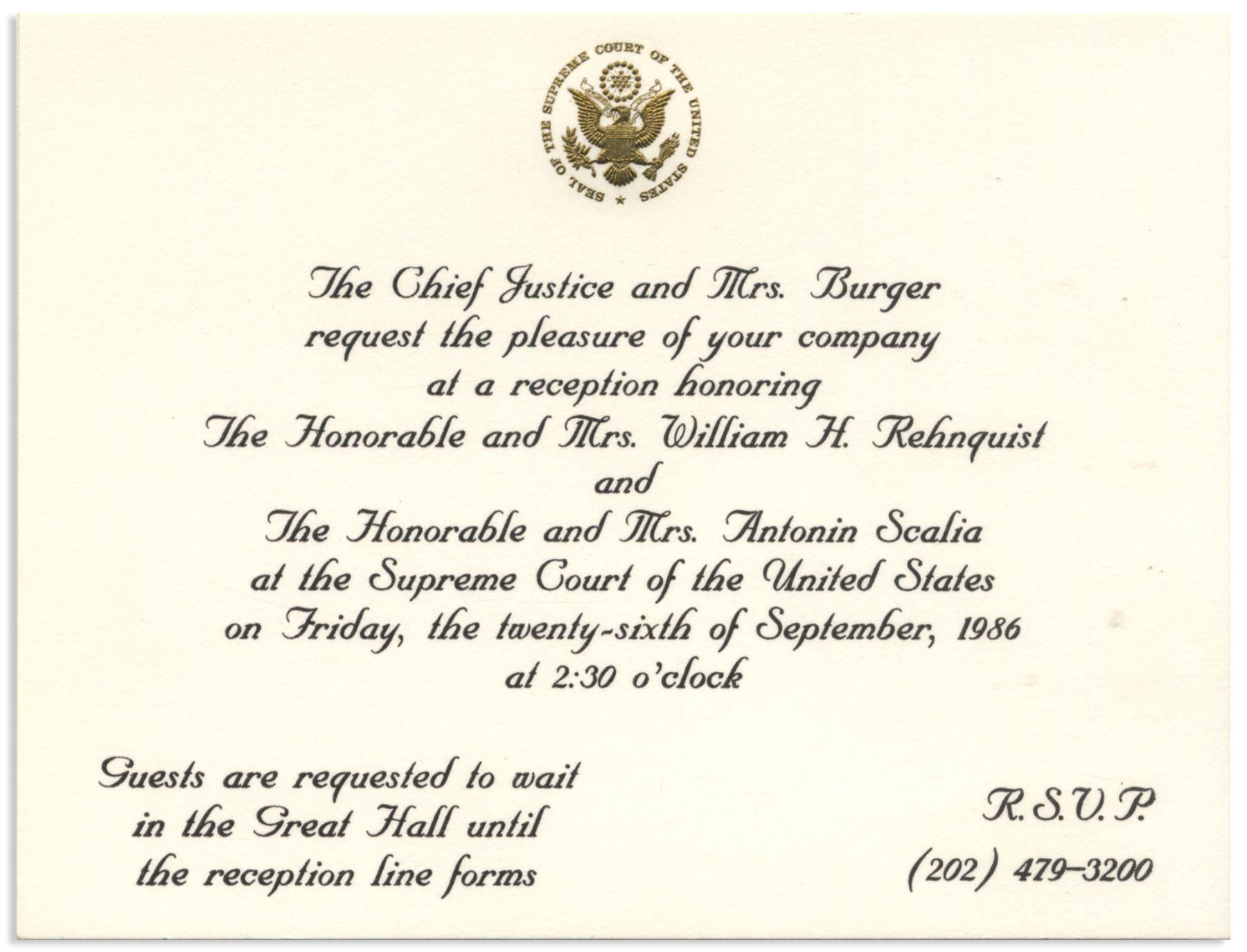 Very rare invitation to the 26 September 1986 investiture ceremony of Supreme Court Chief Justice William Rehnquist and Associate Justice Antonin Scalia, one of the rare occasions where two Justices were sworn-in on the same day. Earlier in the day at the White House, Scalia took the Constitutional Oath from retiring Chief Justice Warren Burger, and then later, at the investiture, the Judicial Oath from incoming Chief Justice William Rehnquist, who had been sworn in only minutes before. Scalia is therefore the only Justice to take oaths from two different Chief Justices on the same day. Invitation card features an embossed gilt Supreme Court seal at top, and original Supreme Court envelope. Card measures 5.875'' x 4.5''. Near fine condition.