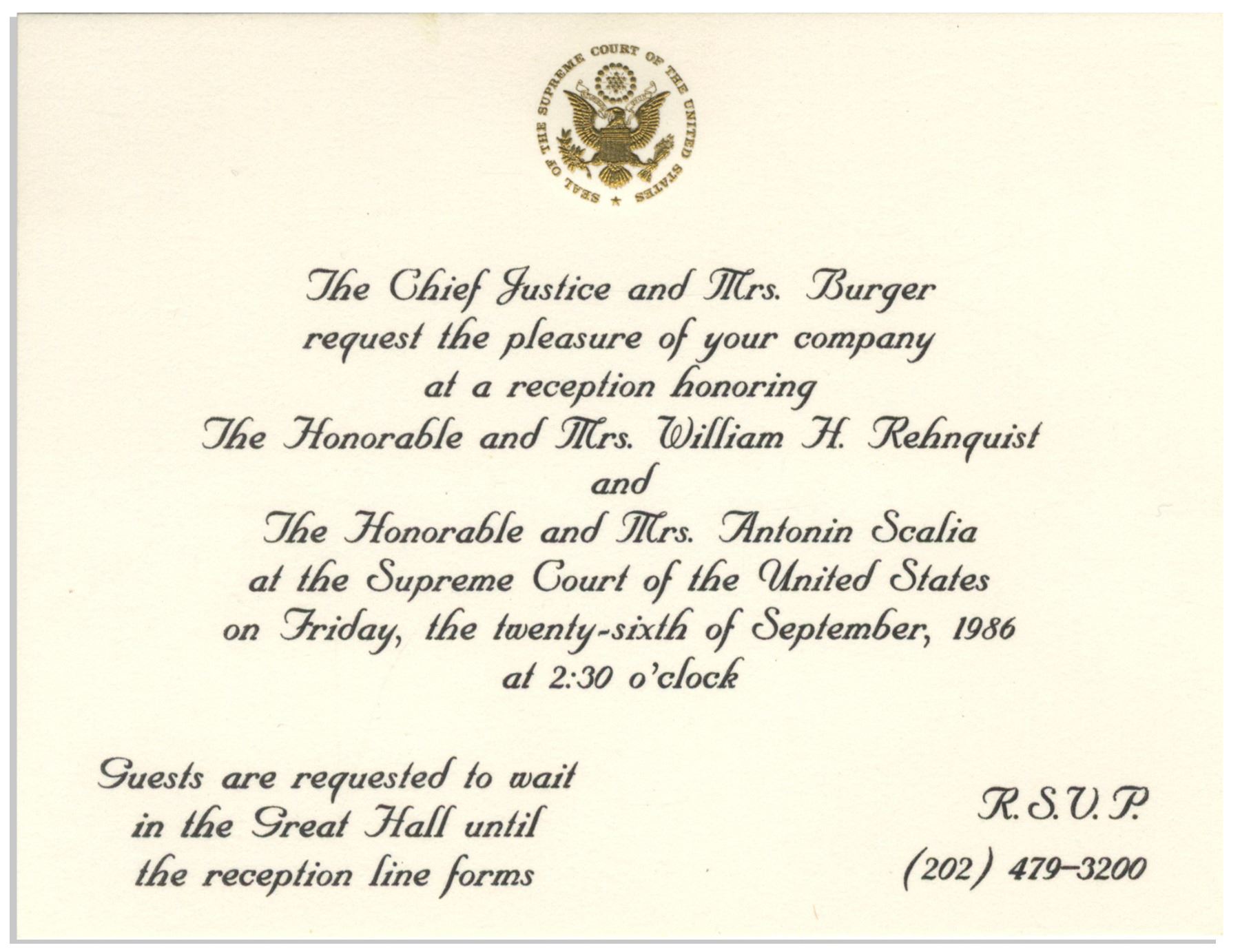 Very rare invitation to the 26 September 1986 investiture ceremony of Supreme Court Chief Justice William Rehnquist and Associate Justice Antonin Scalia, one of the rare occasions where two Justices were sworn-in on the same day. Earlier in the day at the White House, Scalia took the Constitutional Oath from retiring Chief Justice Warren Burger, and then later, at the investiture, the Judicial Oath from incoming Chief Justice William Rehnquist, who had been sworn in only minutes before. Scalia is therefore the only Justice to take oaths from two different Chief Justices on the same day. Invitation card features an embossed gilt Supreme Court seal at top. Card measures 5.875'' x 4.5''. Near fine condition.