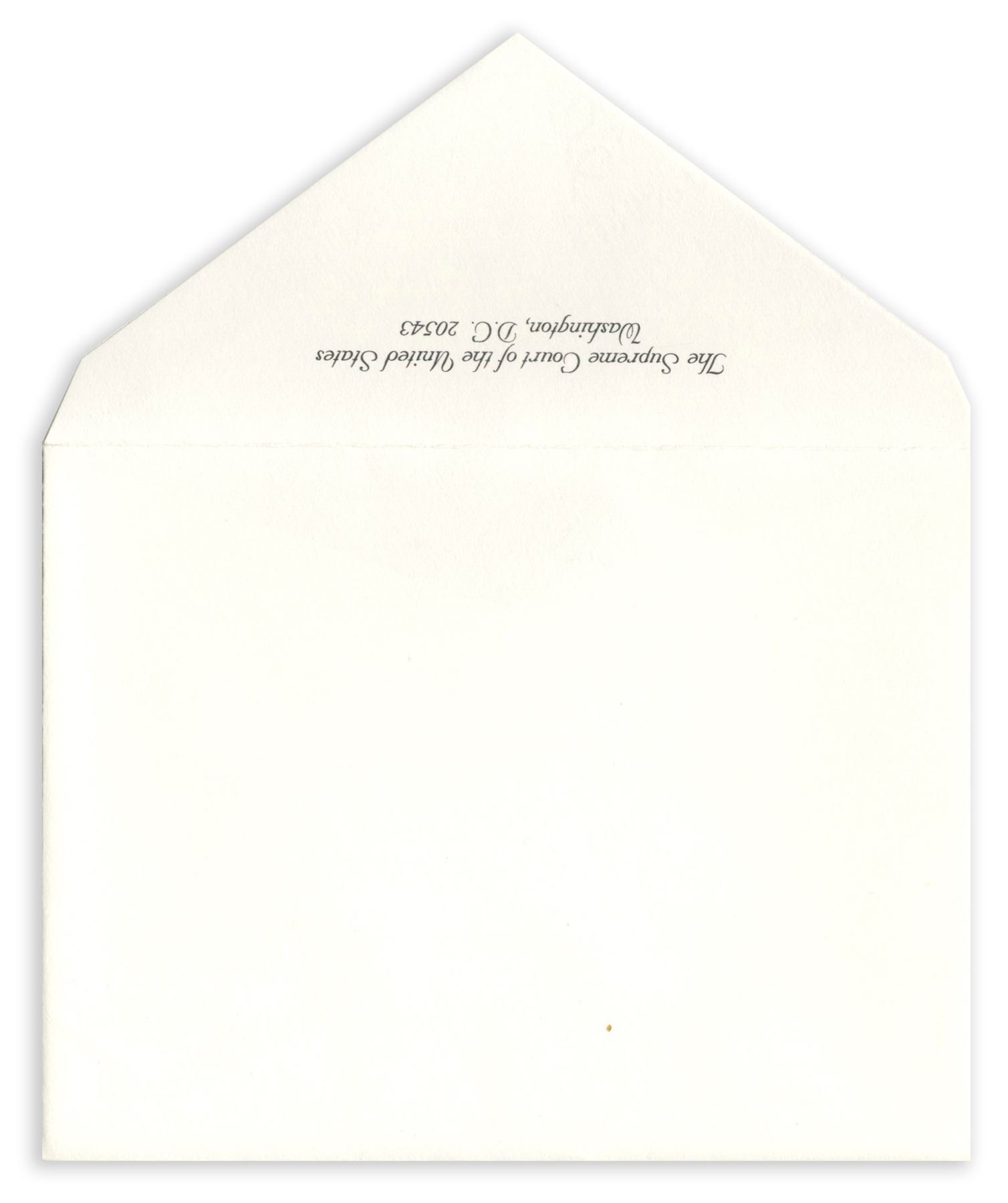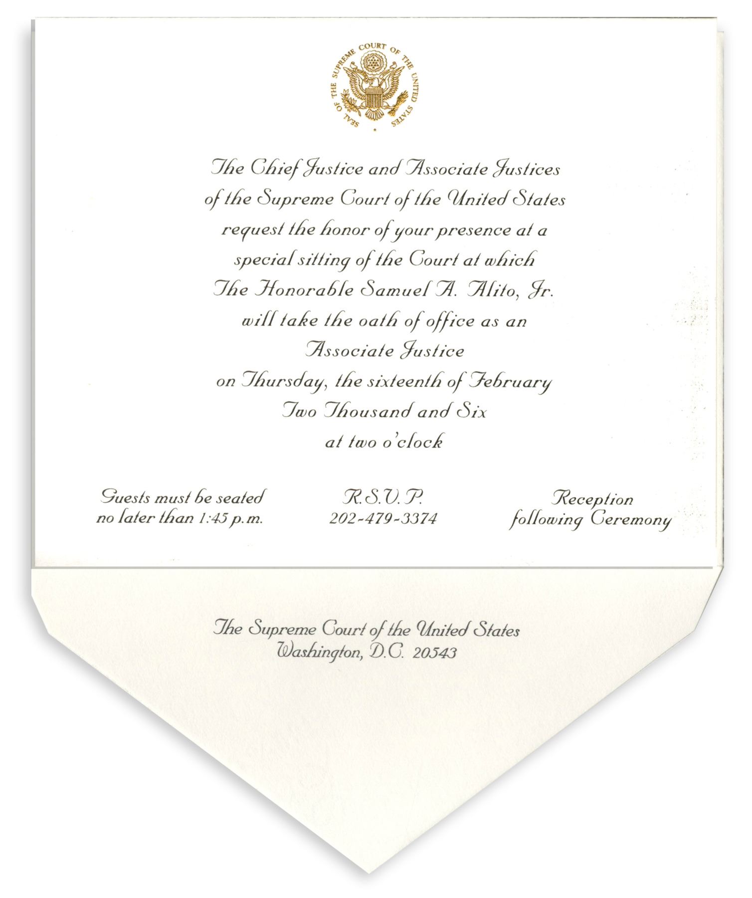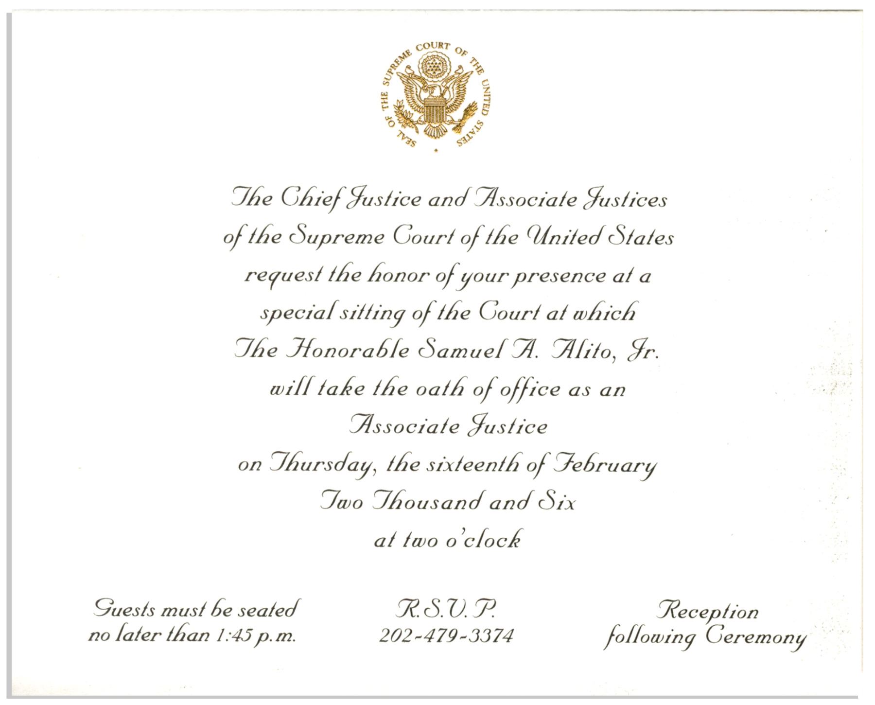 Rare invitation to the 16 February 2006 investiture ceremony of Supreme Court Justice Samuel A. Alito Jr. On this day, Alito took the Judicial Oath of Office in the formal investiture ceremony of the Supreme Court, which followed his informal swearing-in earlier that year. Invitation card features an embossed gilt Supreme Court seal at top, and original Supreme Court envelope. Card measures 5.875'' x 4.5''. Small amount of discoloration along right edge, else near fine condition.