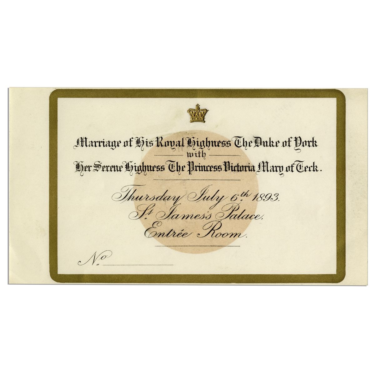 Invitation to the wedding of The Duke of York to Princess Victoria Mary of Teck. Printed invitation bears the date of the ceremony, 6 July 1893 at St. James's Palace. Features a gilt crown at top center and thick gilt border. Measures 6.75'' x 3.75''. Some smudging to ink, else near fine.