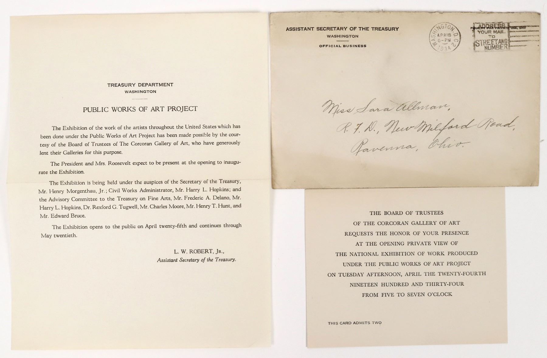 Invitation to the opening of the Public Works of Art Project at the Corcoran Gallery, presented by the United States Treasury Department April 25-May 20, 1934. This comes with a cover letter, explaining the event, an admit two invitation card and the cover addressed to Miss Sara Allman of Ravenna, Ohio. All documents are in very nice condition. Please see photos for more details.