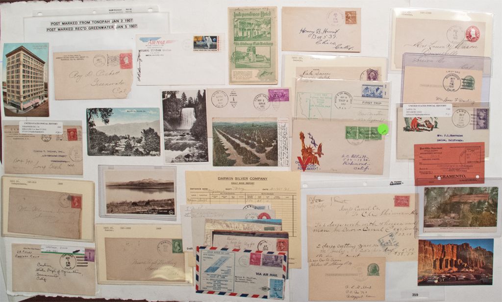 Lot of over 25. Instant Inyo/Mono collection or upgrade an existing collection. 1) Three Olancho including 1911 and 1915 covers. 2) 1889 Keeler Double Circle on envelope. 3) 1905 Johannesburg from Patent Solicitor. 4) 1907 Greenwater on back of envelope. 5) 1899 Independence on cover and 1909 on post card. 6) 1941 Cartago on envelope. 7) 1934 Mono Lake post card. 8) 1944 Mammoth Lakes on envelope. 9) 1939 Wildyrie post card. 10) 1919 Kernville post card. 11) 1917 Atolia post card. 12) Darwin on envelope. 13) 1952 Bishop & Los Angeles first trip. 14) 1931 June Lake. 15) 1961 George Air Force Base. 16) 1944 June Lake on cover. 17) 1937 Death Valley and Lone Pine on cover. 18) 1941 last day Dunmovin. 19) 1911 Lone Pine post card. 20) 1906 Round Valley leather post card. 21) 1899 Olancha on cover. 22) 1907 Laws post card. 23) 1948 Trona. 24) 1970 Mojave Station, Barstow. 25) 1941 Owenyo. (Ames Collection)