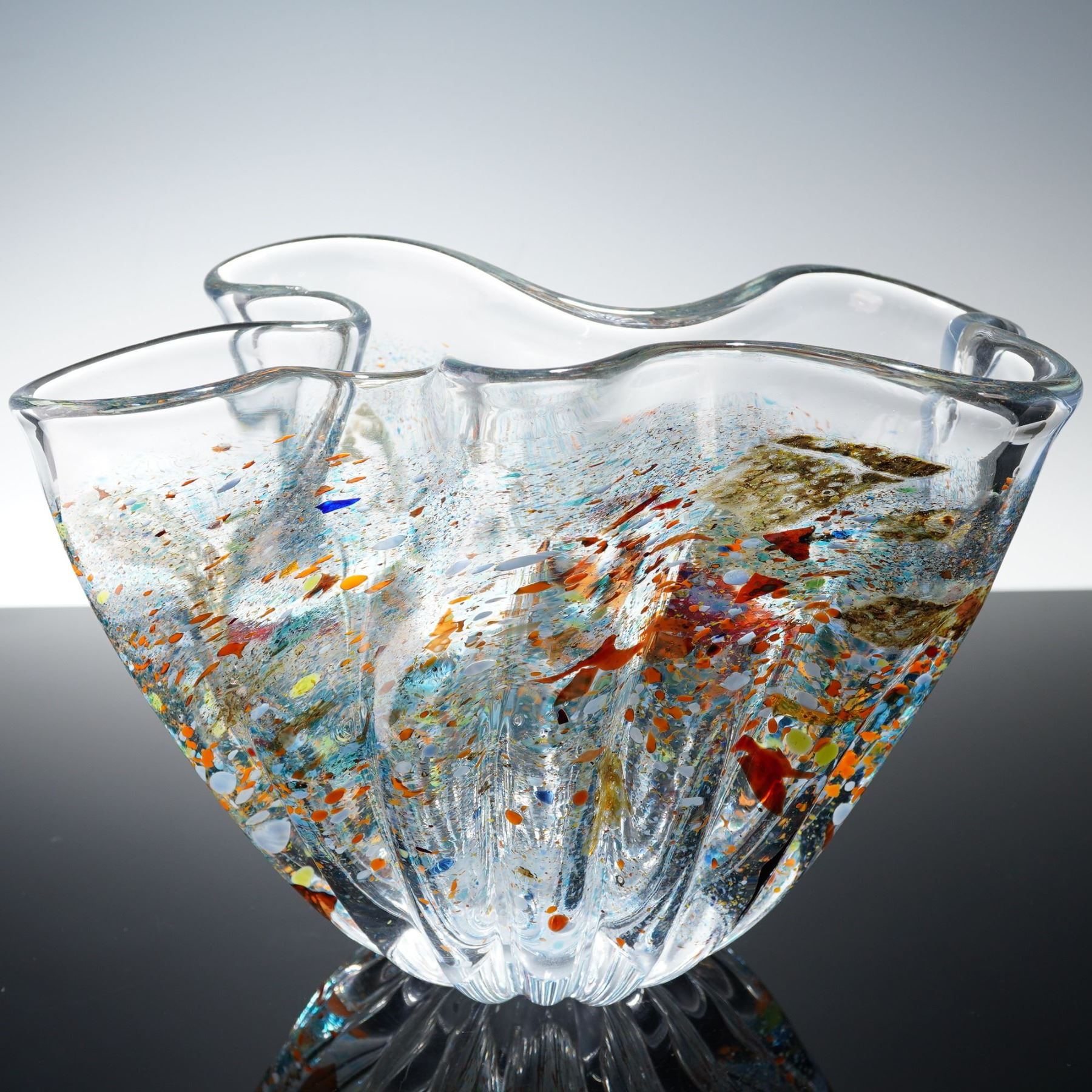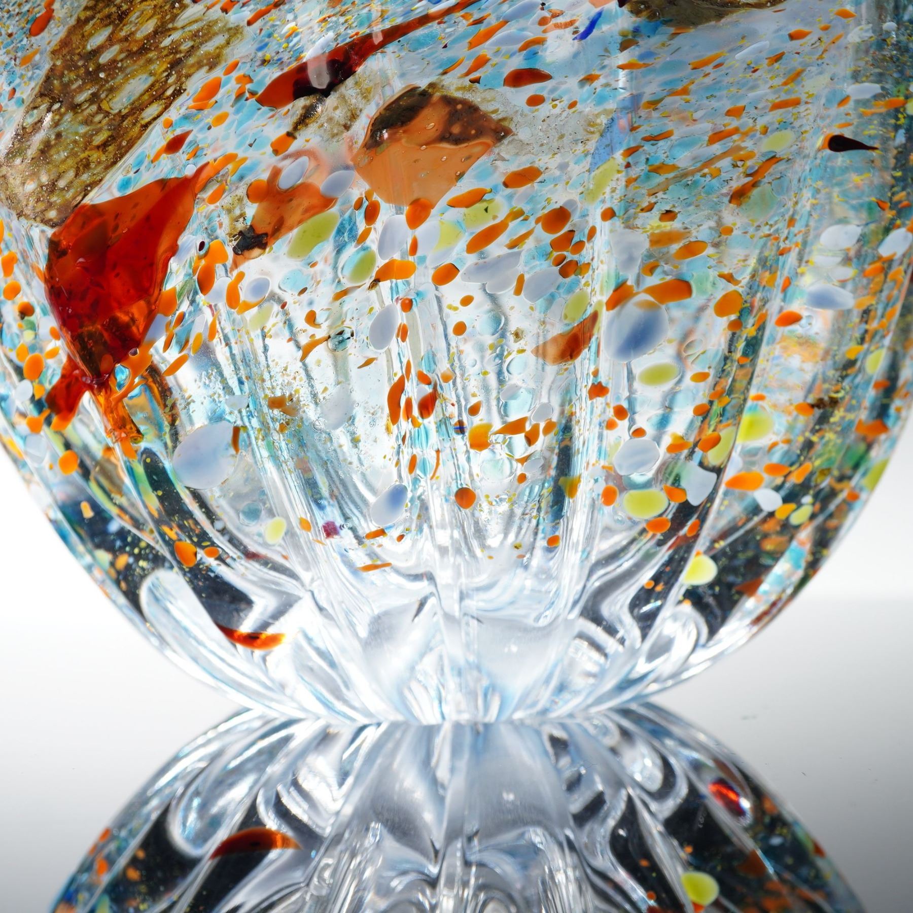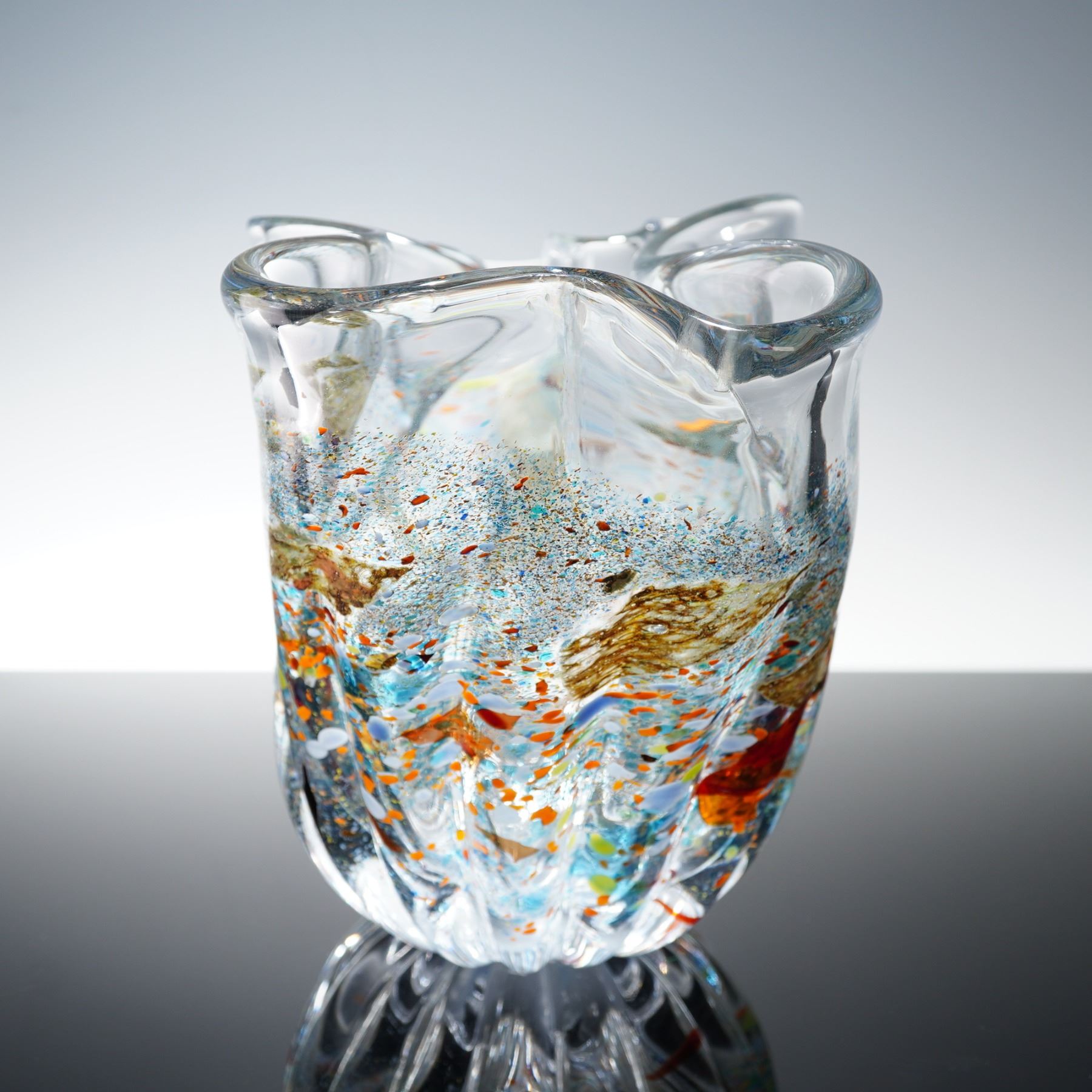 A vibrant handblown art glass vase by Romanian glass artist Ion Tamaian. The freeform vessel features undulating edges and a richly layered design of suspended colored inclusions in tones of orange, blue, gold, and white, encapsulated within clear glass. Tamaian's signature is etched to the base. The sculptural form and dynamic palette exemplify the artist's mastery of contemporary European glass techniques.