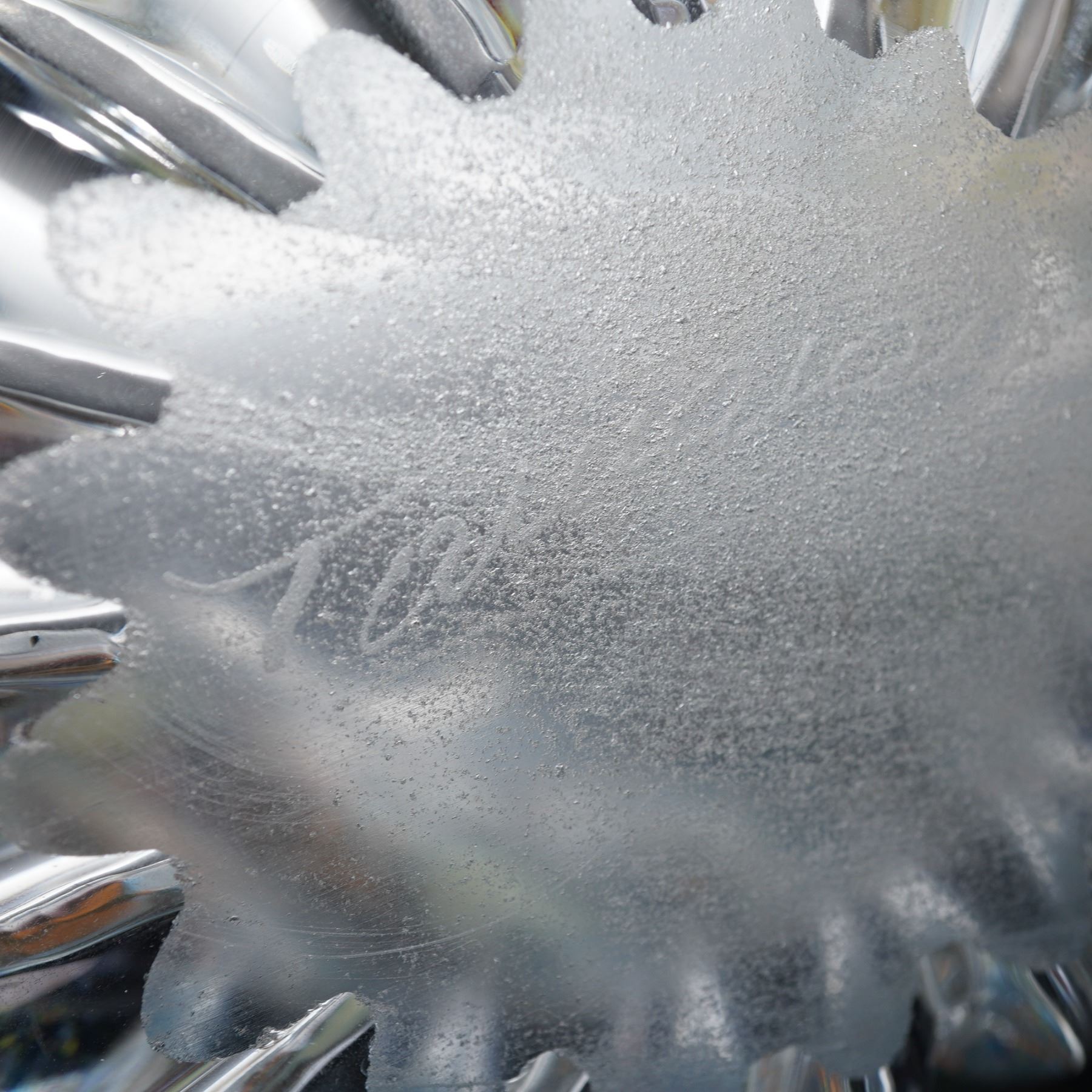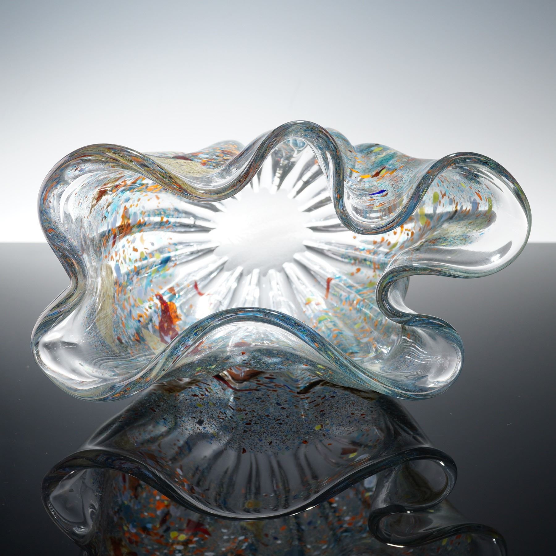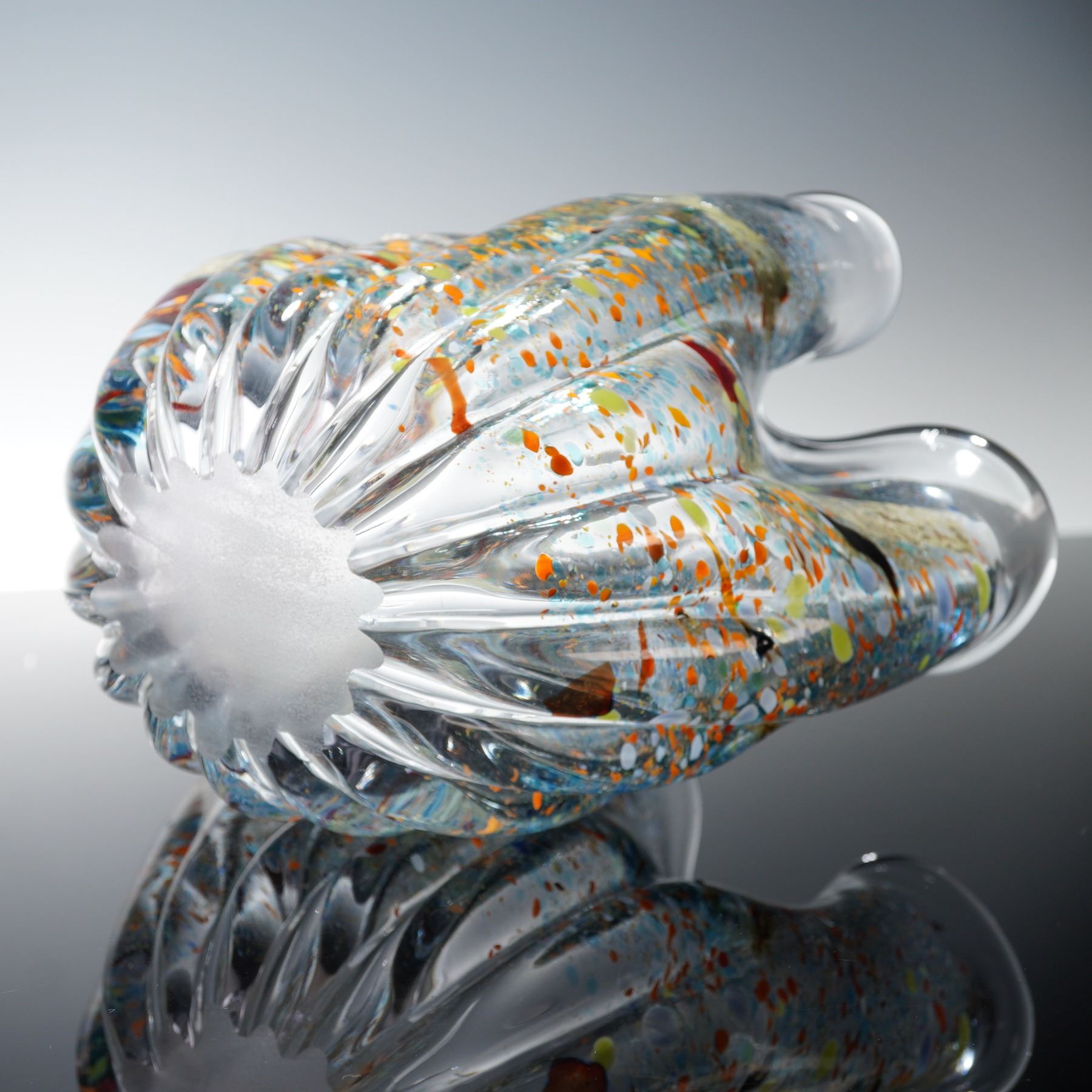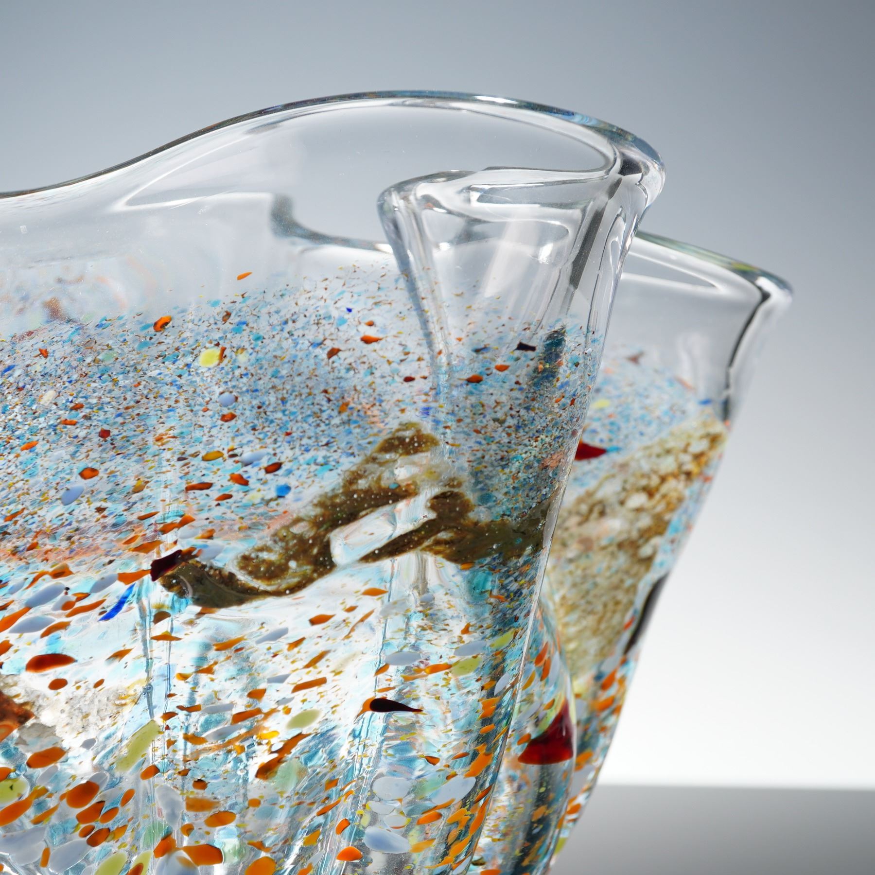 A vibrant handblown art glass vase by Romanian glass artist Ion Tamaian. The freeform vessel features undulating edges and a richly layered design of suspended colored inclusions in tones of orange, blue, gold, and white, encapsulated within clear glass. Tamaian's signature is etched to the base. The sculptural form and dynamic palette exemplify the artist's mastery of contemporary European glass techniques.