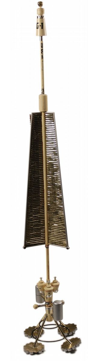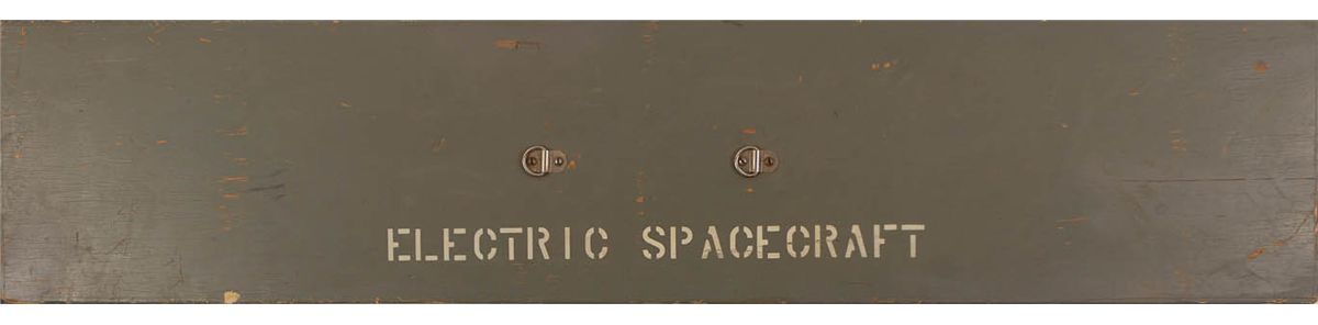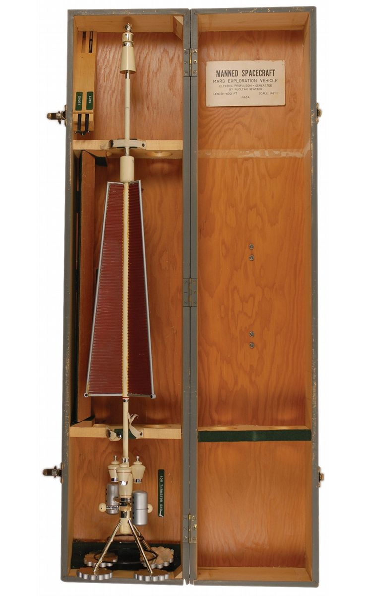 An uncommon and unusual 1/8 scale model of NASA’s Manned Exploration vehicle. Four-piece model measures 39? tall with two revolving pieces. Model is housed in its original wooden box with a label affixed to the inside cover which reads, “Manned Spacecraft; Mars Exploration Vehicle; Electric Propulsion–Generated by Nuclear Reactor. Length—600 Ft. Scale 1/8?=1’ NASA.” Some flaking and chipping to paint resulting in a few areas of surface loss, as well as the partial loss of a few decals, otherwise fine condition. Model originates from the estate of NASA employee Robert Oldrieve.