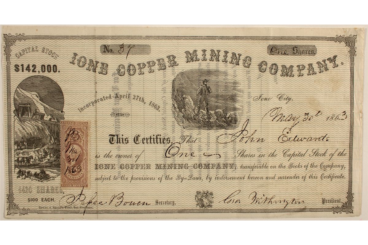 No. 37. Issued to John Edward on May 30, 1863 for 1 share. It was incorporated on April 27, 1863 and located in Ione City. The printer is identified as Towne & Bacon Print, San Francisco. Note that this piece has two vignettes, both marked with the name "Loomis" underneath. There is a 25c revenue stamp located on the lower left side. This company was not listed in the Filer Collection nor is it listed in Brown, 1868. It measures 10.15" x 5.5." This piece has some wear including creases and some small stains on the upper right side.City: County: Alpine State: CADate: 1863