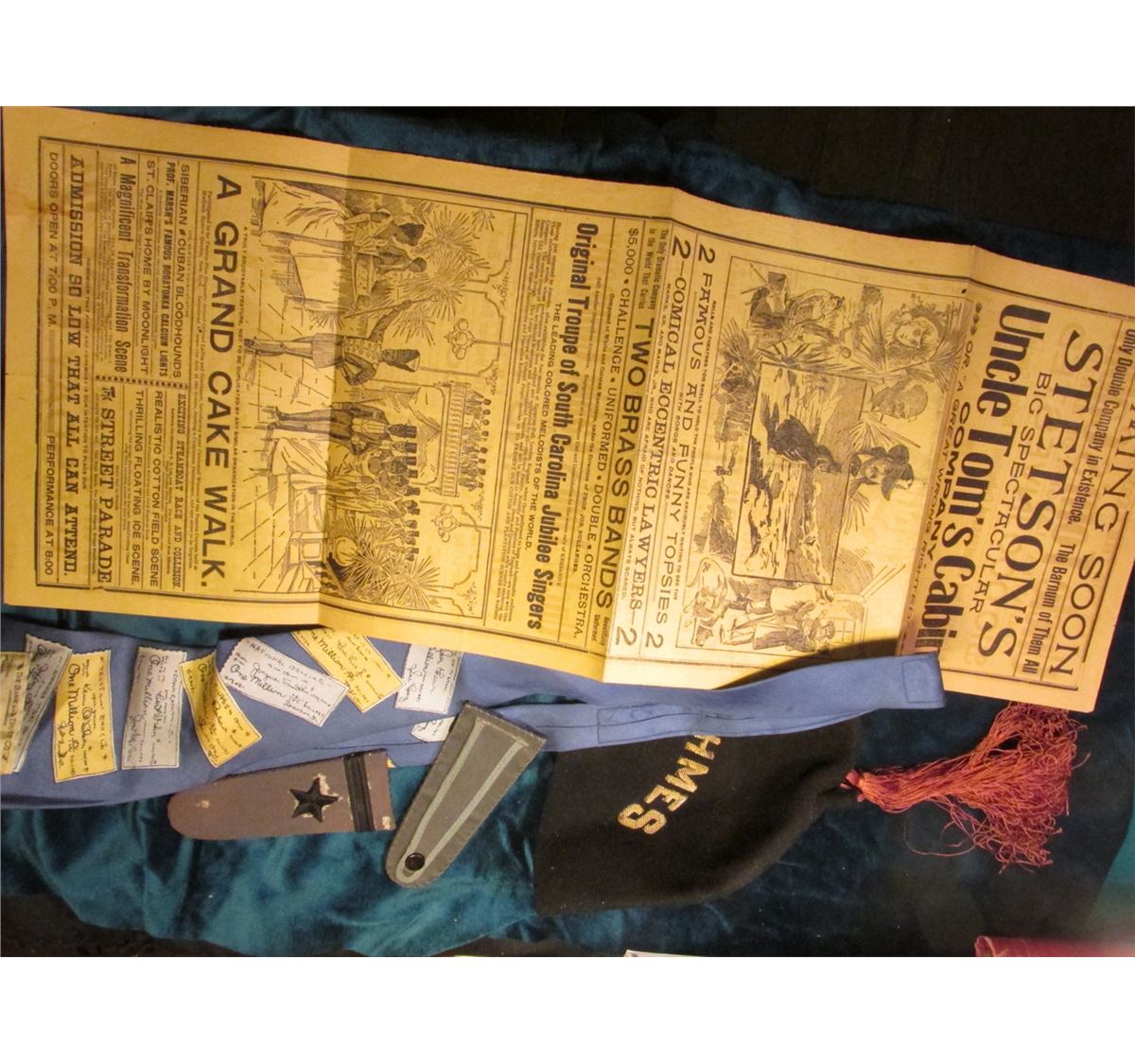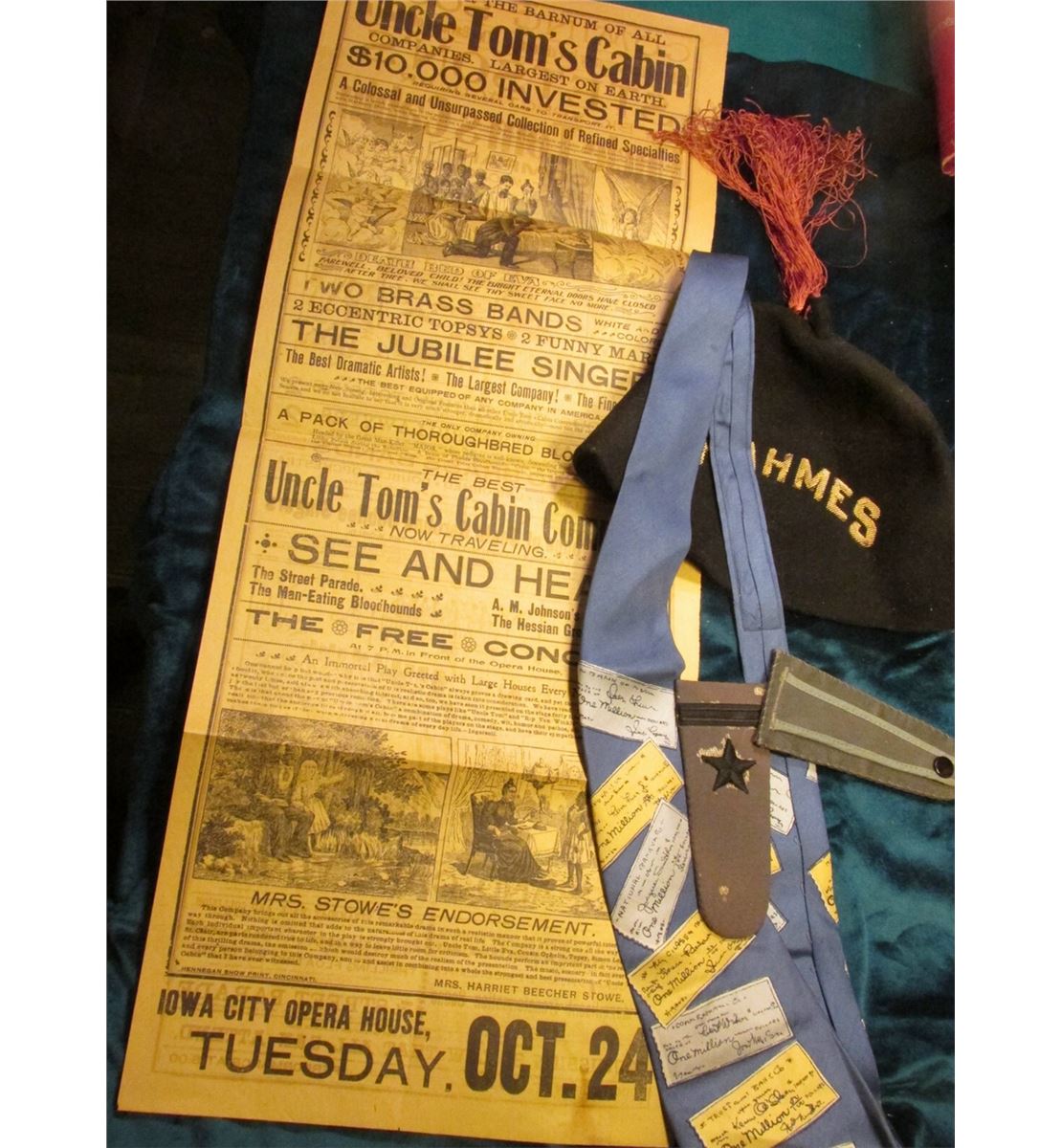 Iowa City Opera House Flyer advertising the Presentation of "Uncle Tom's Cabin"; "AAHMES" Shriner's Fez; "Check Collector's" Tie; & a pair Military Shoulder Epaulets
