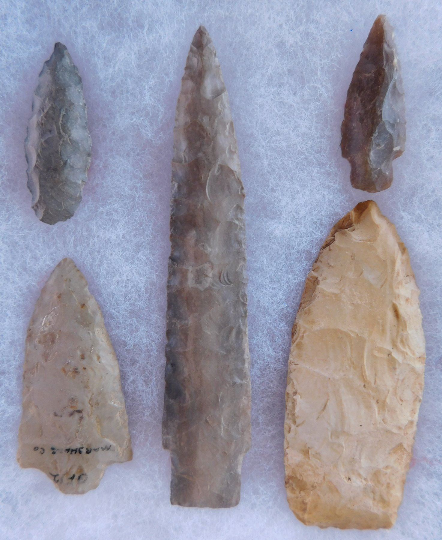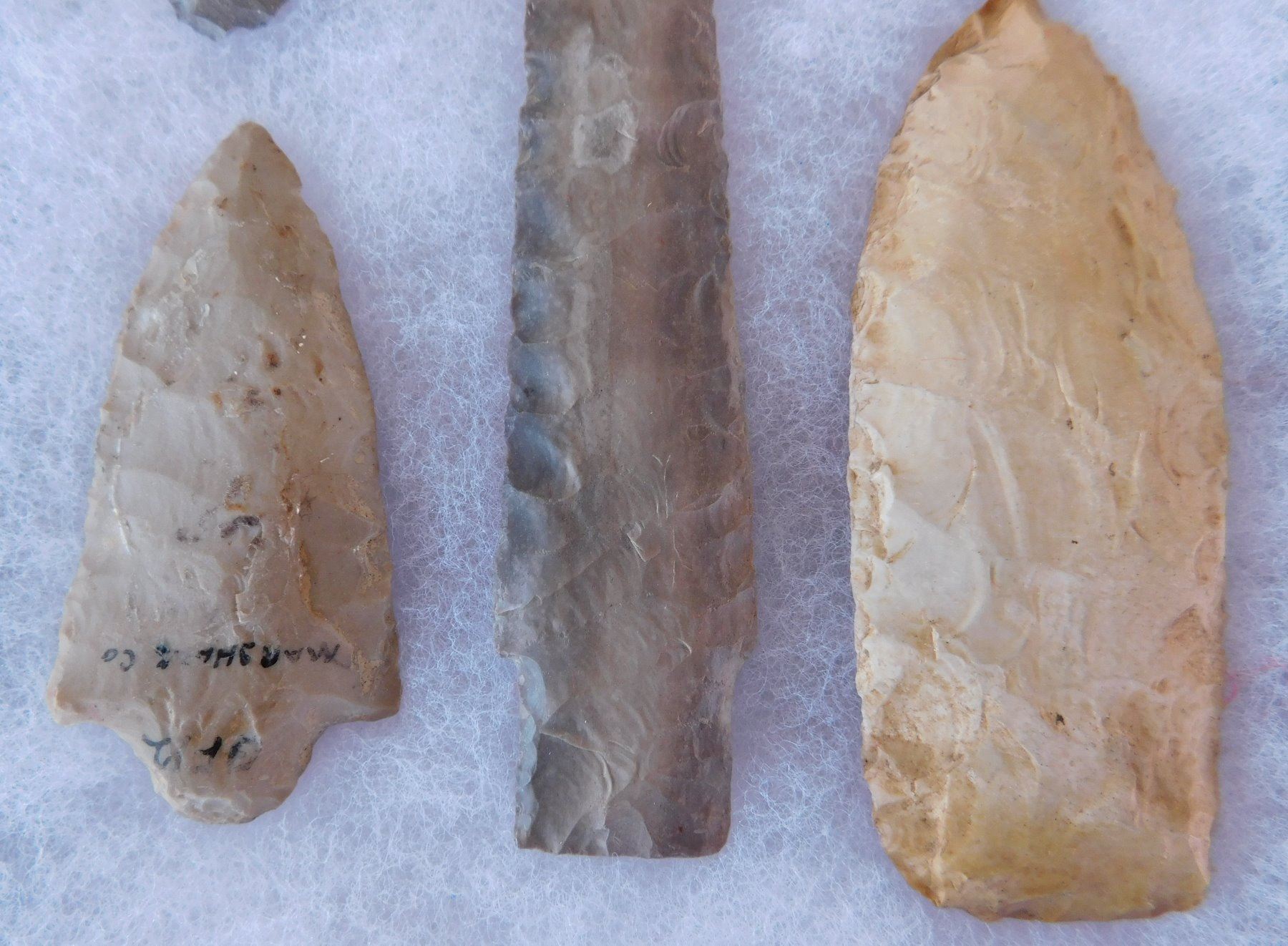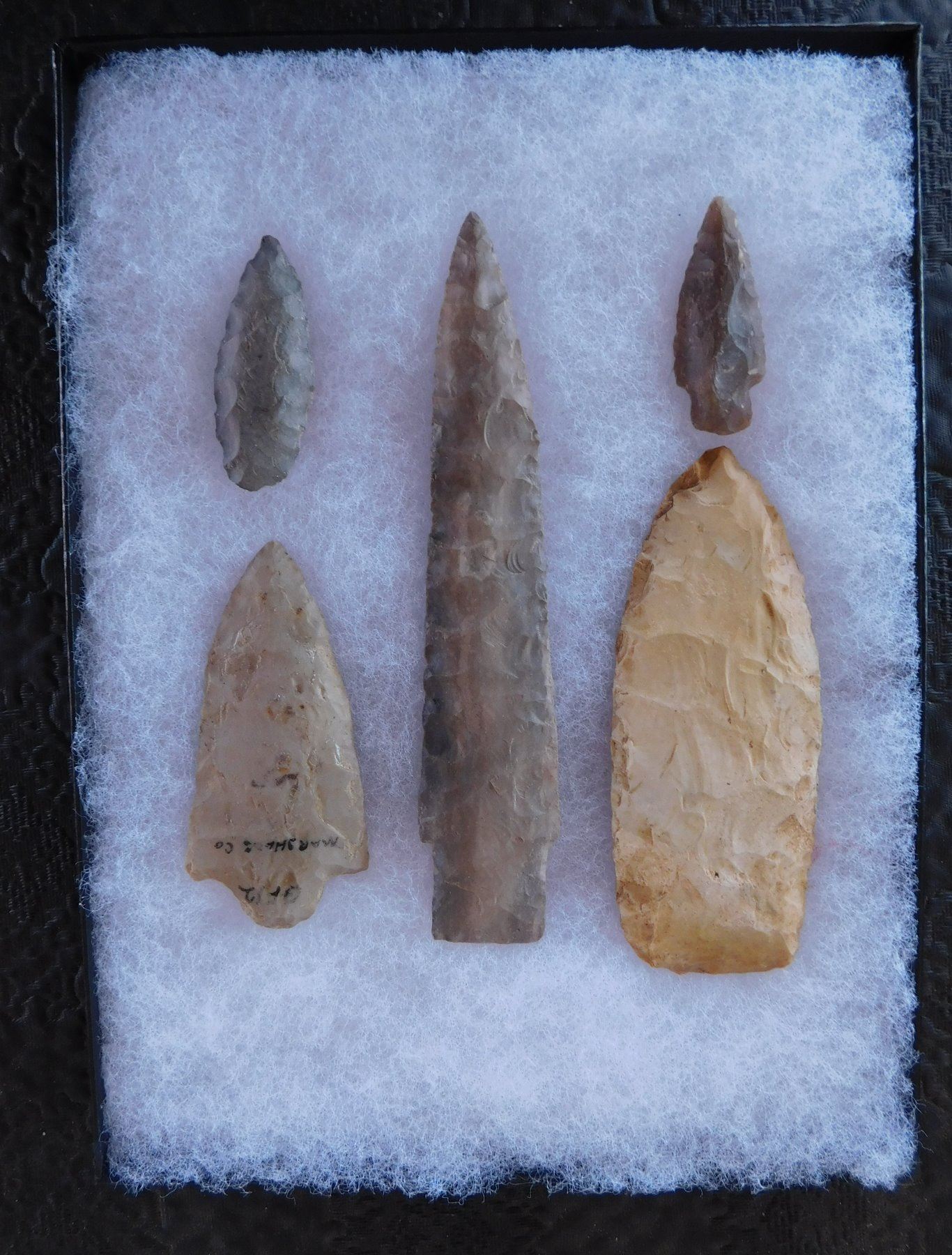 Iowa Points, pre-historic items. Made of chert, the longest item measures 5 1/8". Marshall County, Iowa. Nice point collection, Frame not included. Condition: As found, see images. Shipping: $15.50 w/insurance and signature.