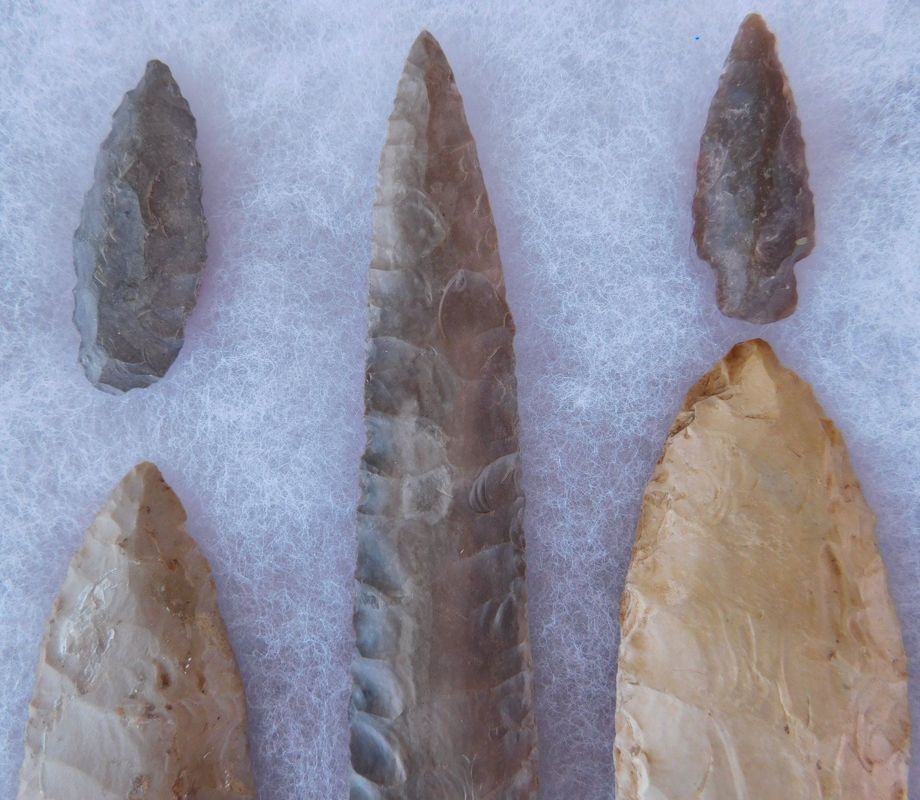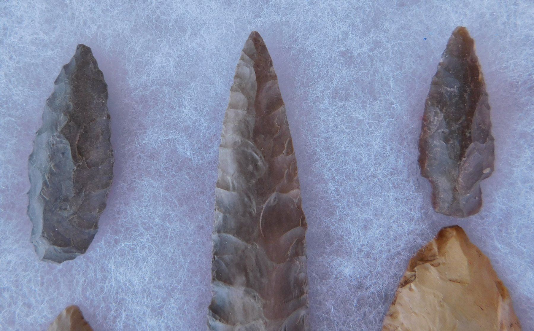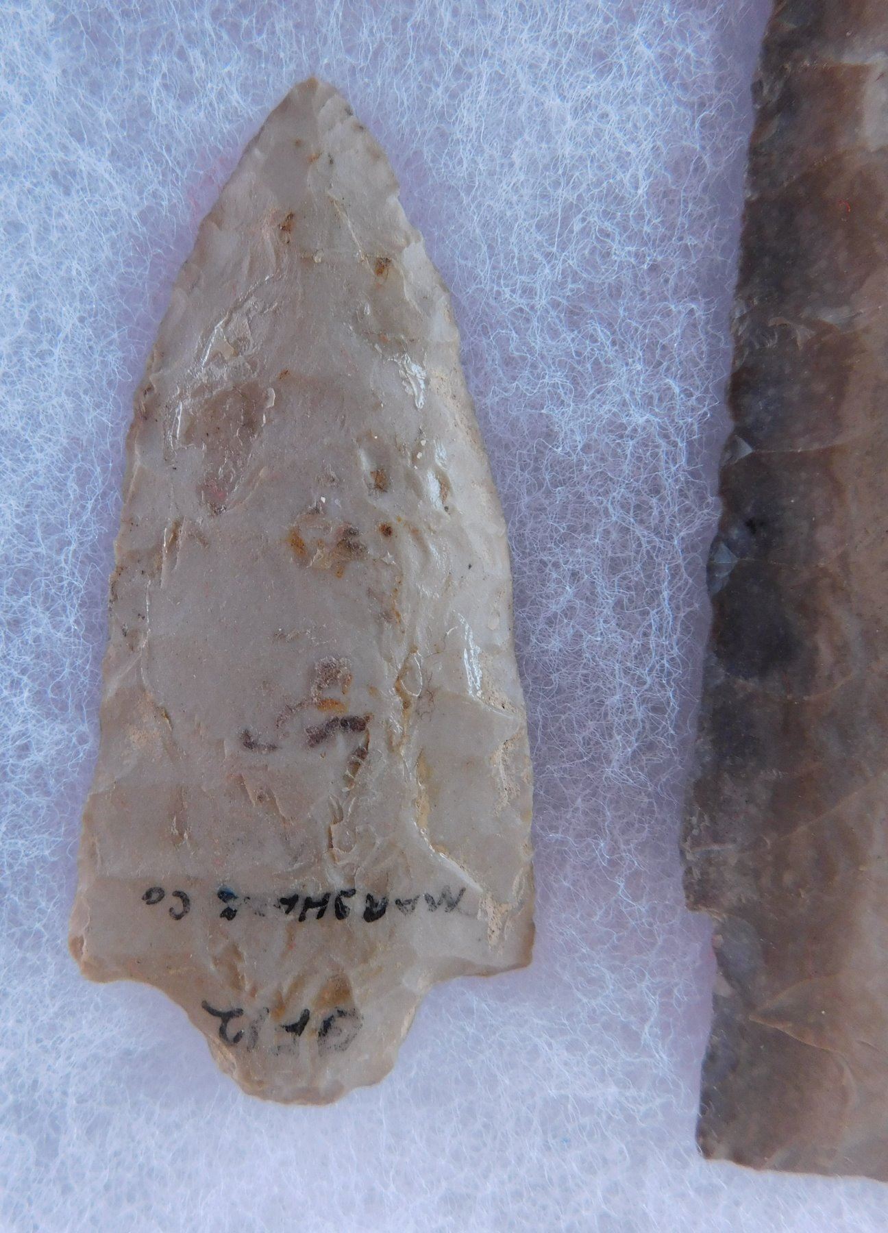 Iowa Points, pre-historic items. Made of chert, the longest item measures 5 1/8". Marshall County, Iowa. Nice point collection, Frame not included. Condition: As found, see images. Shipping: $15.50 w/insurance and signature.
