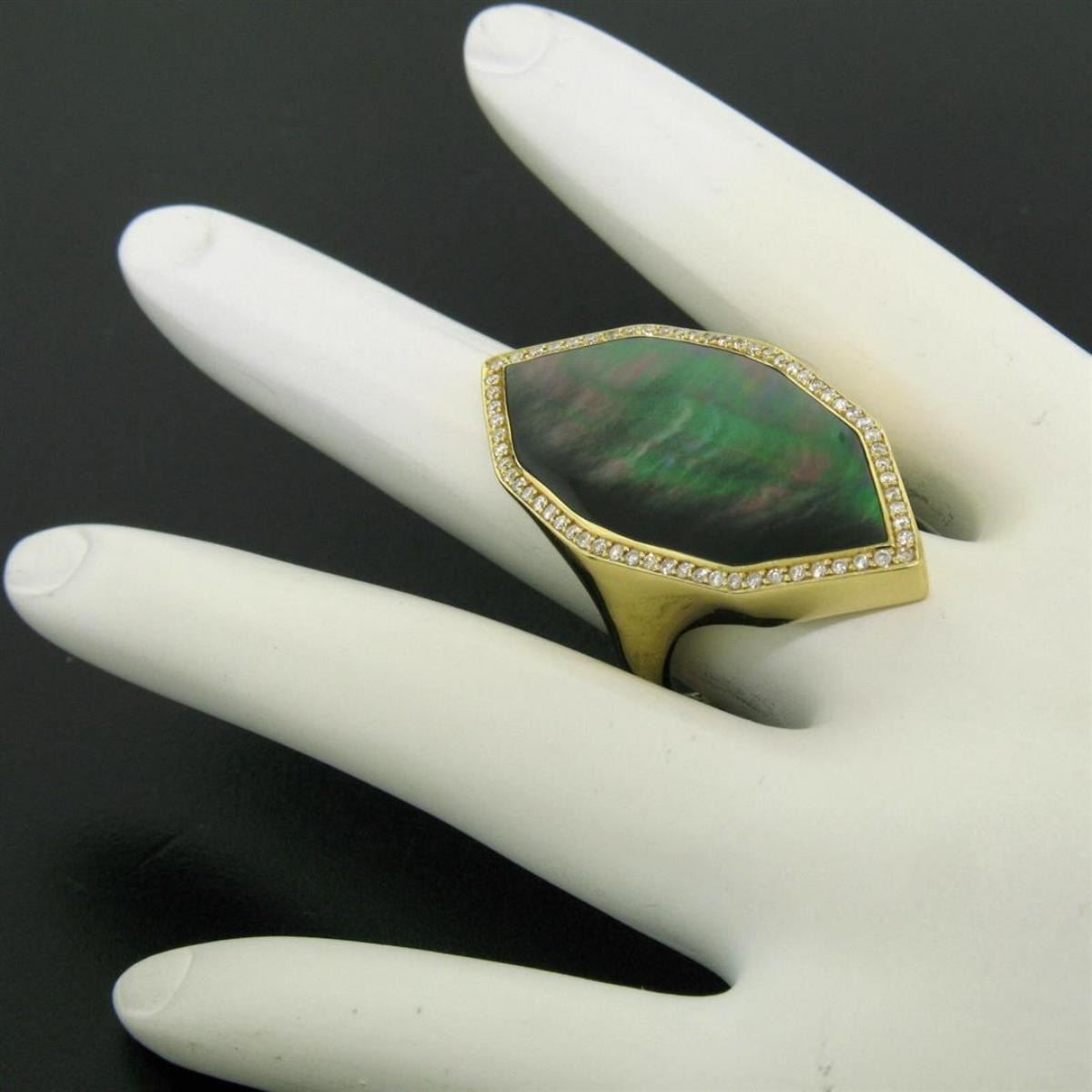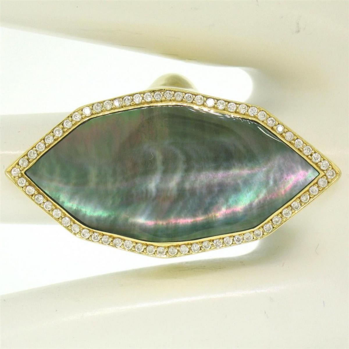 One Ippolita 18K Yellow Gold Large Unique Black Mother of Pearl .65ctw Diamond Ring. Item Details: Material: 18K Solid Yellow Gold, Weight: 13.51 Grams, Stone(s): (1) Natural Genuine Mother of Pearl - Marquise Shape - Bezel Set - Black Color w/ Natural Pink & Green Pearlescense - 32.70x15.15mm (approx.), (65) Natural Genuine Diamonds - Round Brilliant Cut - Prong Set - F Color - VS1 Clarity - 0.65ctw (approx.), Ring Size: 7 , Ring Width: 37.20mm, Ring Height: 5.40mm rise off the finger, Signature: IPPOLITA 18K Condition: Excellent Condition!