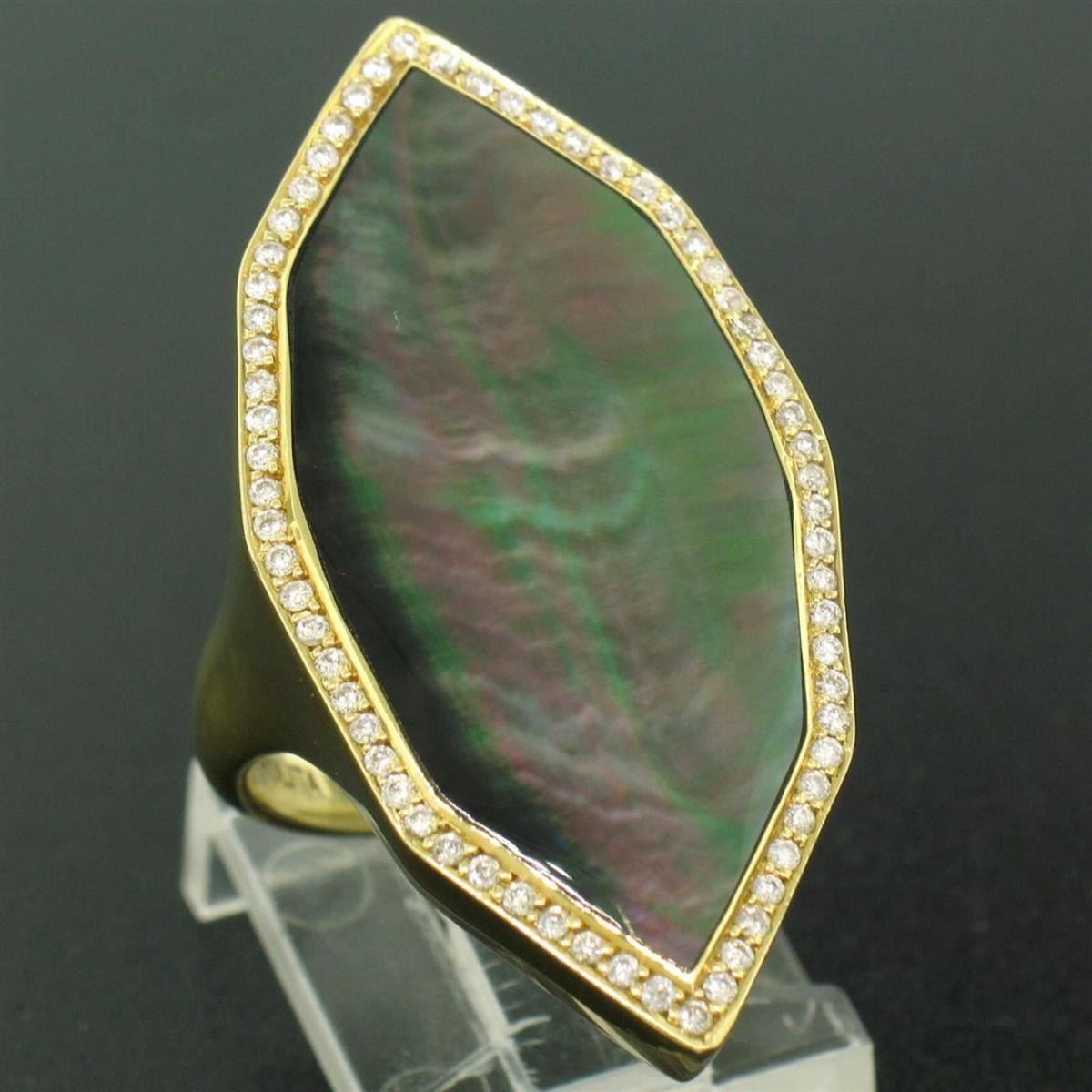 One Ippolita 18K Yellow Gold Large Unique Black Mother of Pearl .65ctw Diamond Ring. Item Details: Material: 18K Solid Yellow Gold, Weight: 13.51 Grams, Stone(s): (1) Natural Genuine Mother of Pearl - Marquise Shape - Bezel Set - Black Color w/ Natural Pink & Green Pearlescense - 32.70x15.15mm (approx.), (65) Natural Genuine Diamonds - Round Brilliant Cut - Prong Set - F Color - VS1 Clarity - 0.65ctw (approx.), Ring Size: 7 , Ring Width: 37.20mm, Ring Height: 5.40mm rise off the finger, Signature: IPPOLITA 18K Condition: Excellent Condition!