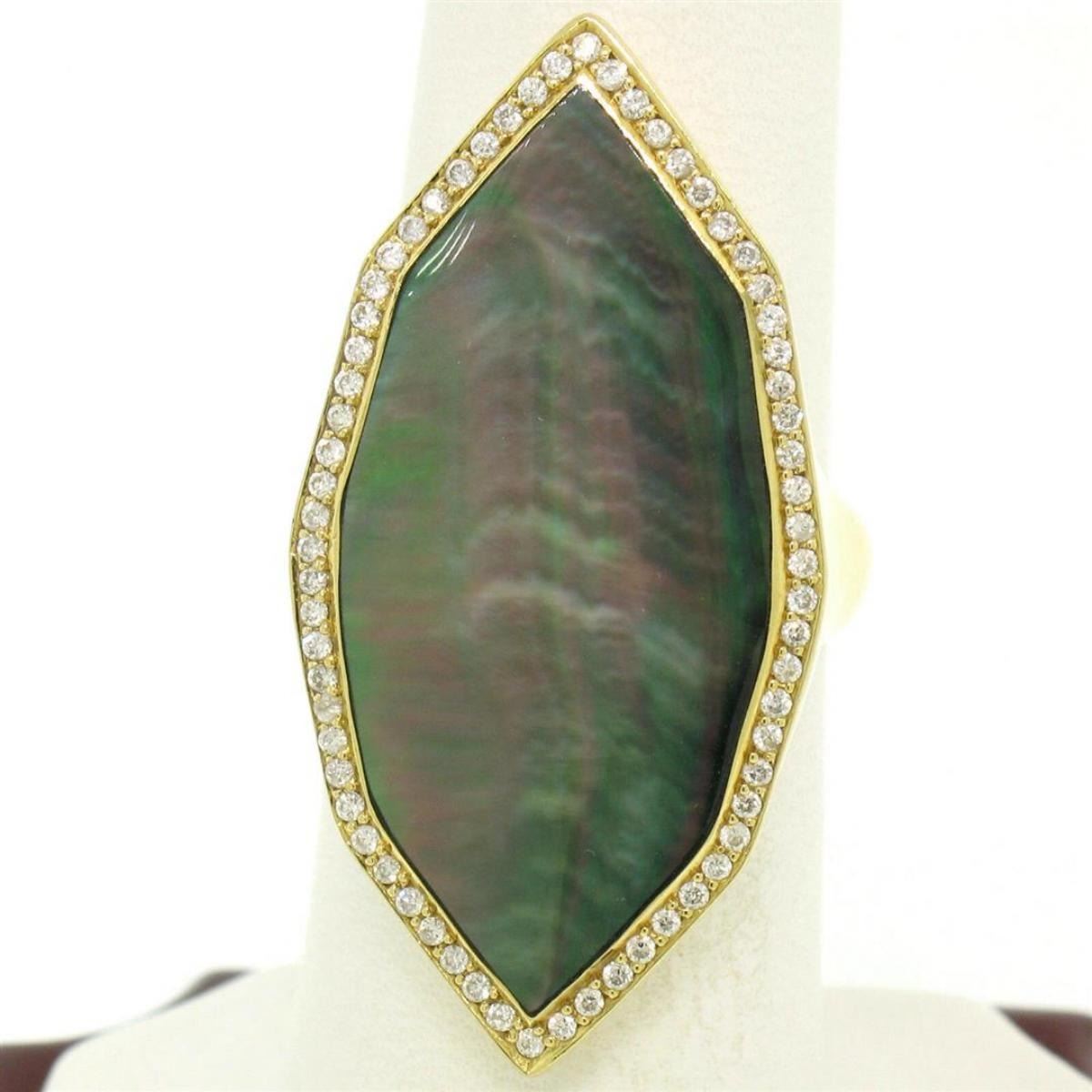 One Ippolita 18K Yellow Gold Large Unique Black Mother of Pearl .65ctw Diamond Ring. Item Details: Material: 18K Solid Yellow Gold, Weight: 13.51 Grams, Stone(s): (1) Natural Genuine Mother of Pearl - Marquise Shape - Bezel Set - Black Color w/ Natural Pink & Green Pearlescense - 32.70x15.15mm (approx.), (65) Natural Genuine Diamonds - Round Brilliant Cut - Prong Set - F Color - VS1 Clarity - 0.65ctw (approx.), Ring Size: 7 , Ring Width: 37.20mm, Ring Height: 5.40mm rise off the finger, Signature: IPPOLITA 18K Condition: Excellent Condition!