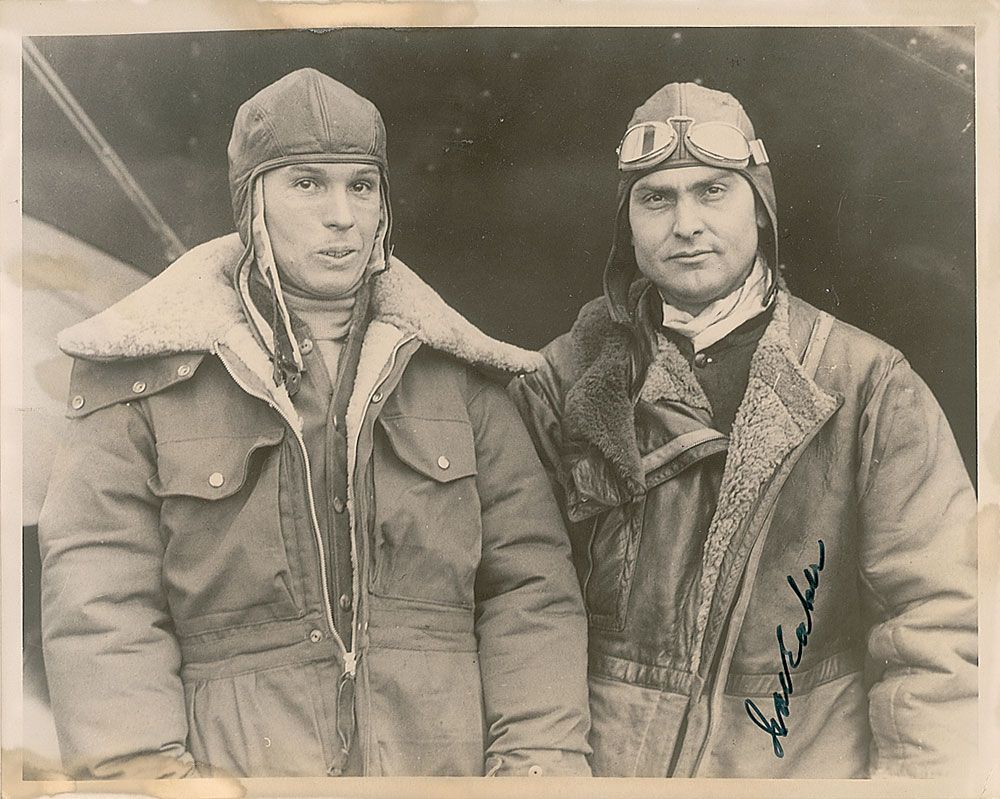 General of the United States Army Air Force, who commanded the Eighth Air Force during World War II (1896–1987). Matte-finish 10 x 8 photo of a young Eaker in his flight gear posing alongside another pilot, signed vertically in black felt tip. In fine condition, with some scattered light dampstaining along edges.