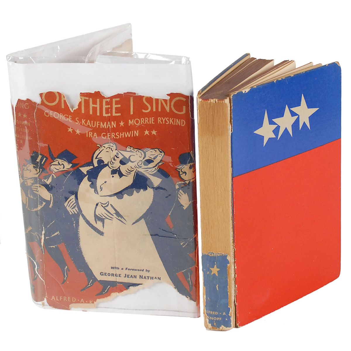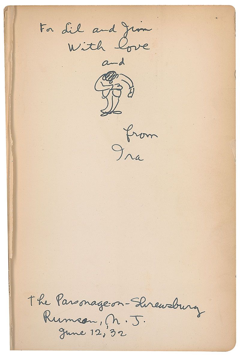Signed book: Of Thee I Sing. First edition. NY: Alfred A. Knopf, 1932. Hardcover with dust jacket, 5.5 x 7.75, 214 pages. Signed and inscribed on the first free end page in fountain pen, “For Lil and Jim, with love, from Ira.” Gershwin also adds a small original portrait of himself bowing, adding the place and date below, “The Parsonage-on-Shrewsbury, Rumson, N. J., June 12, 32.” Autograph is bold and in fine condition; book has cracked hinges, peeling to spine, and significant paper loss and tears to brittle dust jacket, otherwise very good condition.