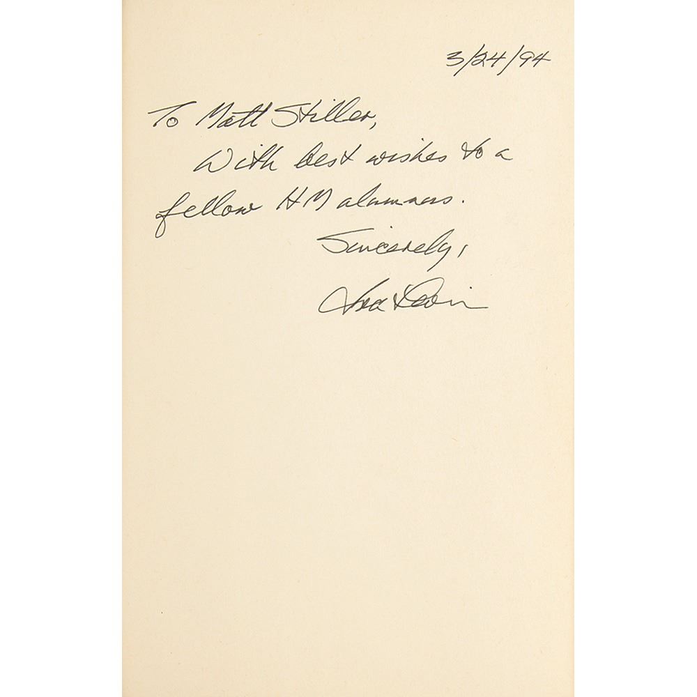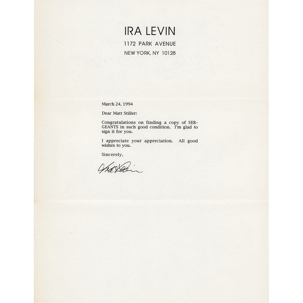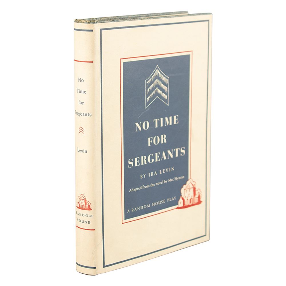 Signed book: No Time For Sergeants. First edition. NY: Random House, 1956. Hardcover with dust jacket, 5.75 x 8.25, 176 pages. Signed and inscribed on the first free end page in black felt tip, "To Matt…With best wishes to a fellow HM alumnus. Sincerely, Ira Levin, 3/24/94." In fine condition. Accompanied by a TLS from Levin, in part: "Congratulations on finding a copy of Sergeants in such good condition. I'm glad to sign it for you."