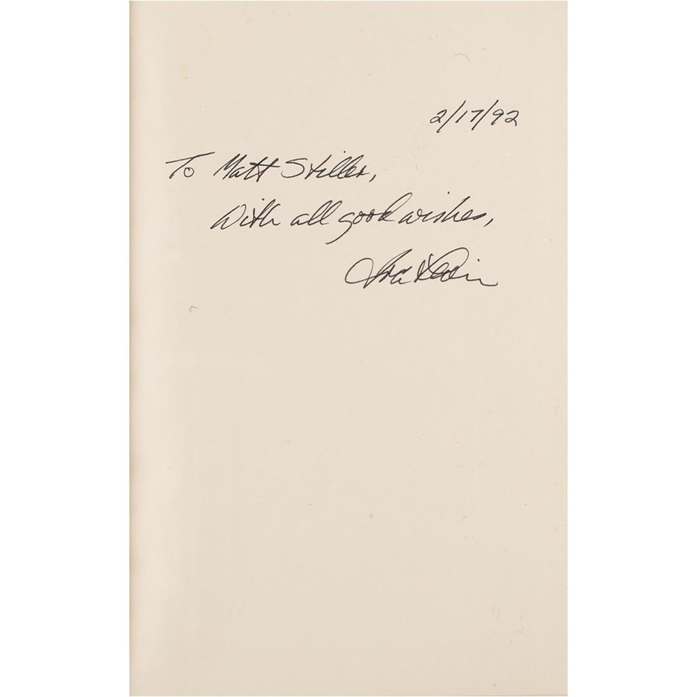 Signed book: The Boys from Brazil. First edition. NY: Random House, 1976. Hardcover with dust jacket, 5.75 x 8.5, 312 pages. Signed and inscribed on the first free end page in black ink, "To Matt Stiller, with all good wishes, Ira Levin, 2/17/92." In fine condition. The work was made into a 1978 British-American thriller film directed by Franklin J. Schaffner and starring Gregory Peck and Laurence Olivier, who received an Oscar nomination for his role as Ezra Lieberman.