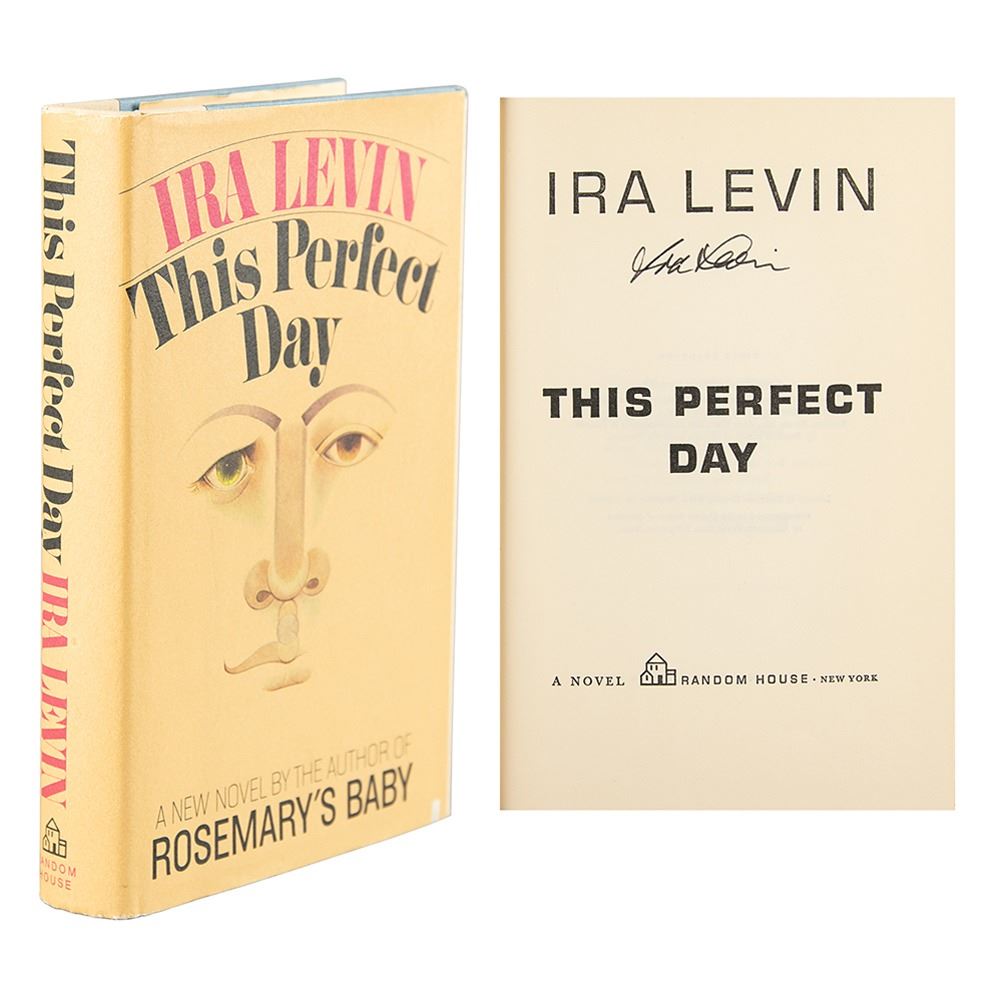 Signed book: This Perfect Day. First edition. NY: Random House, 1970. Hardcover with dust jacket, 5.75 x 8.5, 309 pages. Signed on the title page in black felt tip, "Ira Levin." In fine condition, with a tiny chip to the front panel of the unclipped jacket. A desirable and uncommon signed example of Levin's third novel, and one of only two Levin novels yet to be adapted to film.
