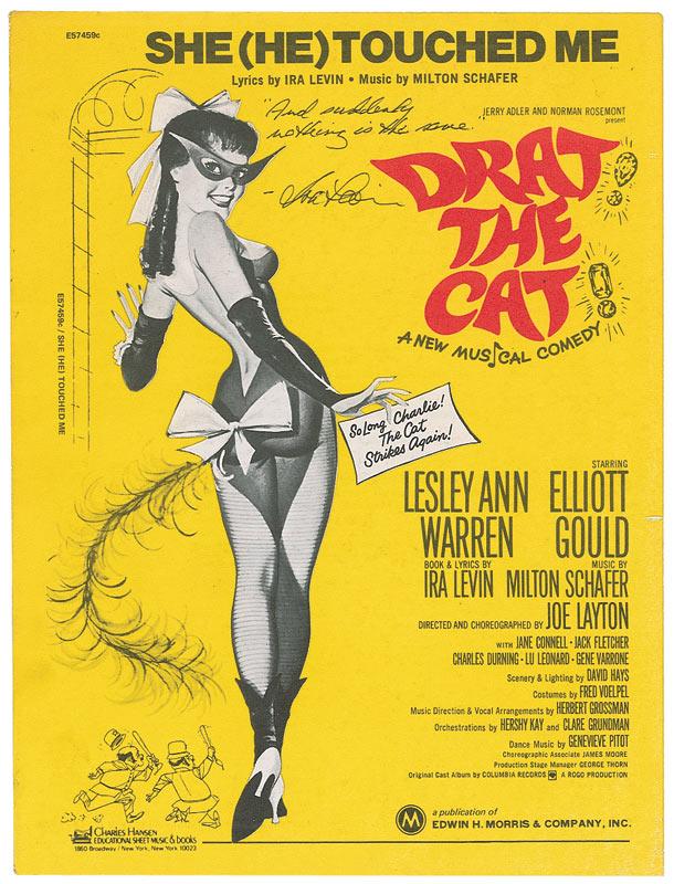 American author, dramatist and songwriter (1929-2007). Sheet music cover for ‘She (He) Touched Me,’ 8.25 x 11, seven pages signed in black ballpoint “’And suddenly nothing is the same.’ Ira Levin.” In fine condition with some creases and scattered staining.