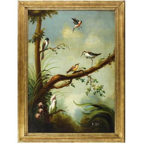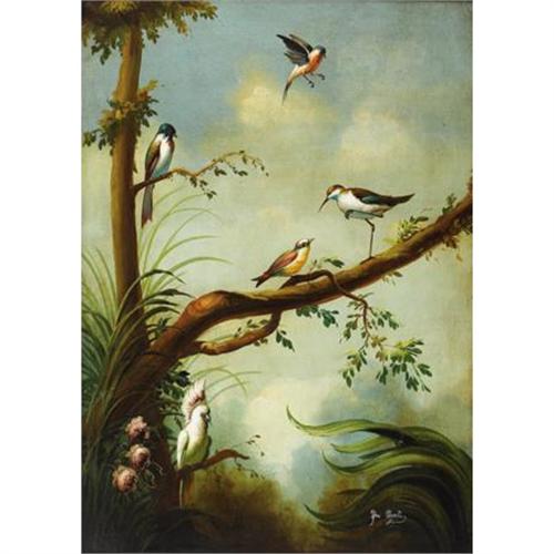 <B>IRA MONTE (Spanish, b. 1918)</B></I><BR><I>Tropical Birds</B></I><BR>Oil on canvas<BR>55 x 39 inches (139.7 x 99.1 cm)<BR>Signed lower right:<I> Ira Monte</B></I><BR>
