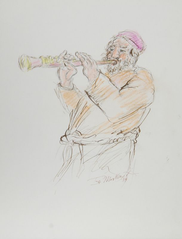 Ira Moskowitz, Clarinet Player, Ink and Pastel Drawing