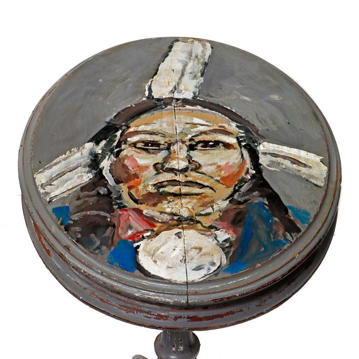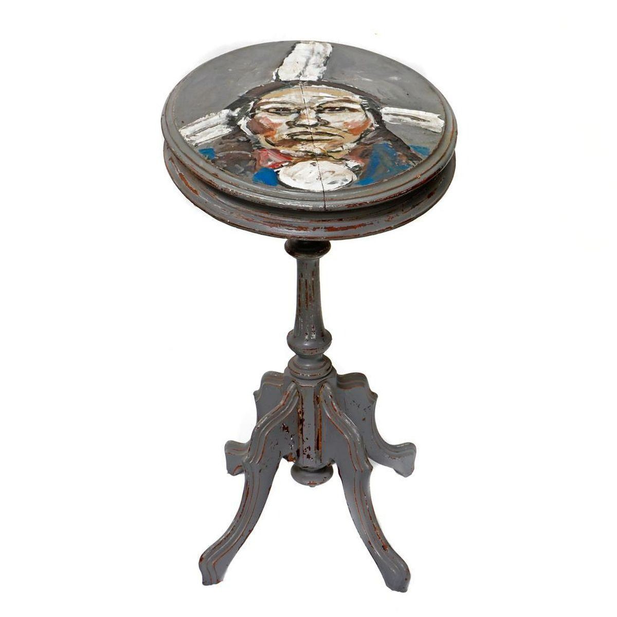 Artist: Ira Yeager (1938-2022). Title/Subject: Native American man (painted end table). Size: 28 1/2in x 21 1/4in x 15 3/4in. Year Created: 20th century. Signature: Unsigned (from the Estate of Ira Yeager). Medium/Ground: Oil and acrylic on pedestal end table. Condition: Good; light staining on table surface. Condition Report: All lots are sold as is and where is. Turner Auctions + Appraisals, LLC provides condition reports upon request to aid in your bidding decision. No statement regarding age, condition, kind, value, or quality of a lot, whether made orally at the auction or at any other time, or in writing in this catalog or elsewhere, shall be construed to be an express or implied warranty, representation, or assumption of liability. All sales are final, Turner Auctions + Appraisals, LLC does not give refunds based on condition. Turner Auctions + Appraisals, LLC does not perform any shipping or packing services. We do have a list of suggested shippers who gladly provide quotes prior to your bidding. Please visit our webpage for a list of recommended shippers.