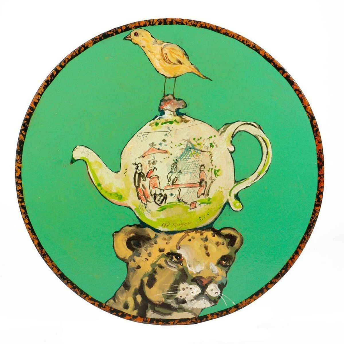 Artist: Ira Yeager (1938-2022). Title/Subject: Leopard, teapot, and bird. Size: 18in diam. Year Created: 20th century. Signature: Signed lower/center in teapot. Medium/Ground: Oil on canvas. Condition: Good. Condition Report: All lots are sold as is and where is. Turner Auctions + Appraisals, LLC provides condition reports upon request to aid in your bidding decision. No statement regarding age, condition, kind, value, or quality of a lot, whether made orally at the auction or at any other time, or in writing in this catalog or elsewhere, shall be construed to be an express or implied warranty, representation, or assumption of liability. All sales are final, Turner Auctions + Appraisals, LLC does not give refunds based on condition. Turner Auctions + Appraisals, LLC does not perform any shipping or packing services. We do have a list of suggested shippers who gladly provide quotes prior to your bidding. Please visit our webpage for a list of recommended shippers.