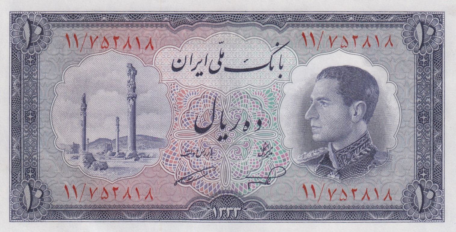 Iran, 10 Rials, 1954, UNC, p64br/Shah Pahlavi portrait, there are count fractures