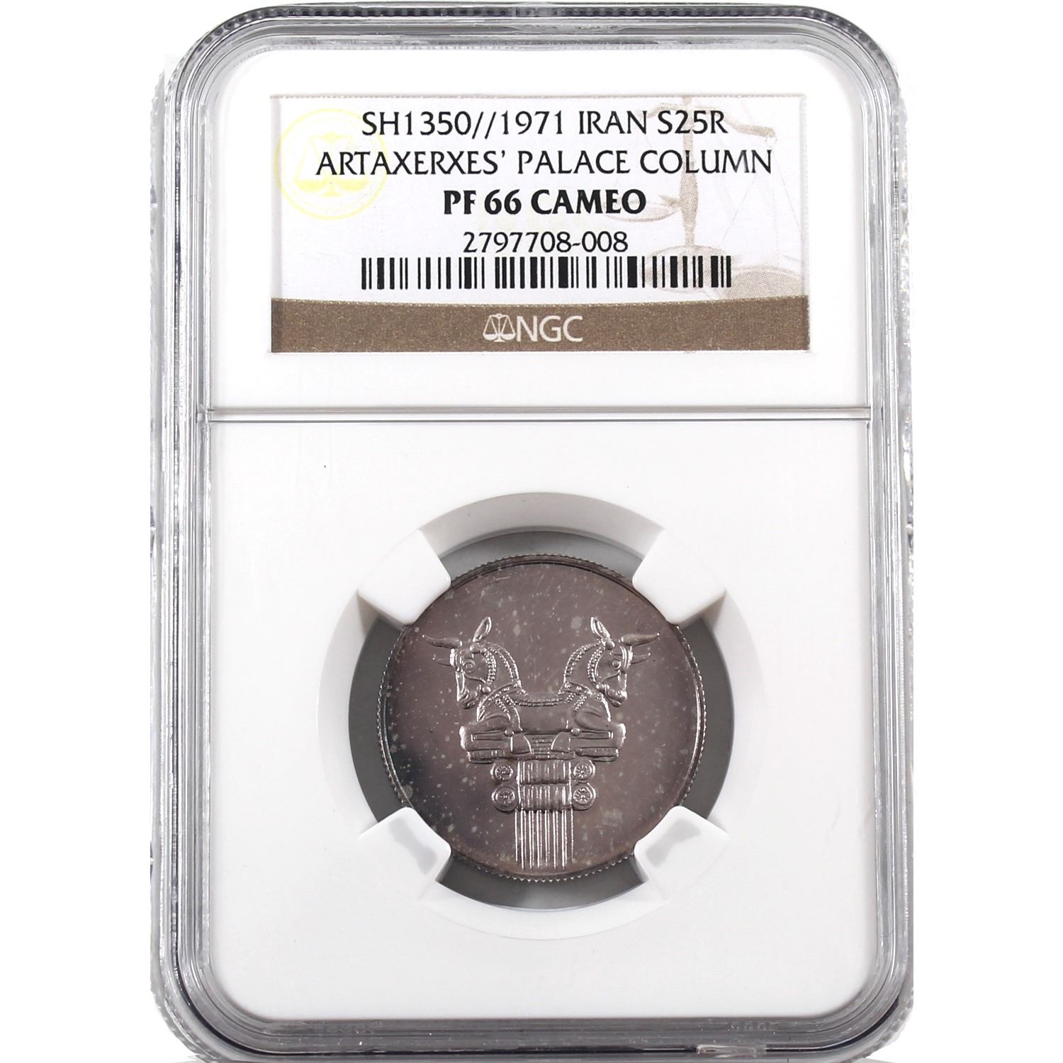 Iran 1971 Silver 25 Rials Commemorative featuring Palace Column. NGC Certified PF-66 Cameo! Beautiful soft violet tones throughout.