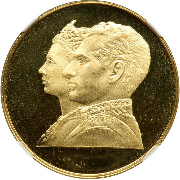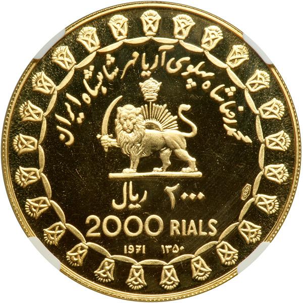 Iran. 2000 Rials, 1971. Fr-106; KM-1192. Weight 0.7540 ounce. Mintage 9,805. For the 2500th Anniversary of Persian Empire. Busts of Imperial couple left. Reverse: Crown above lion, value below. NGC graded Proof 65 Ultra Cameo.