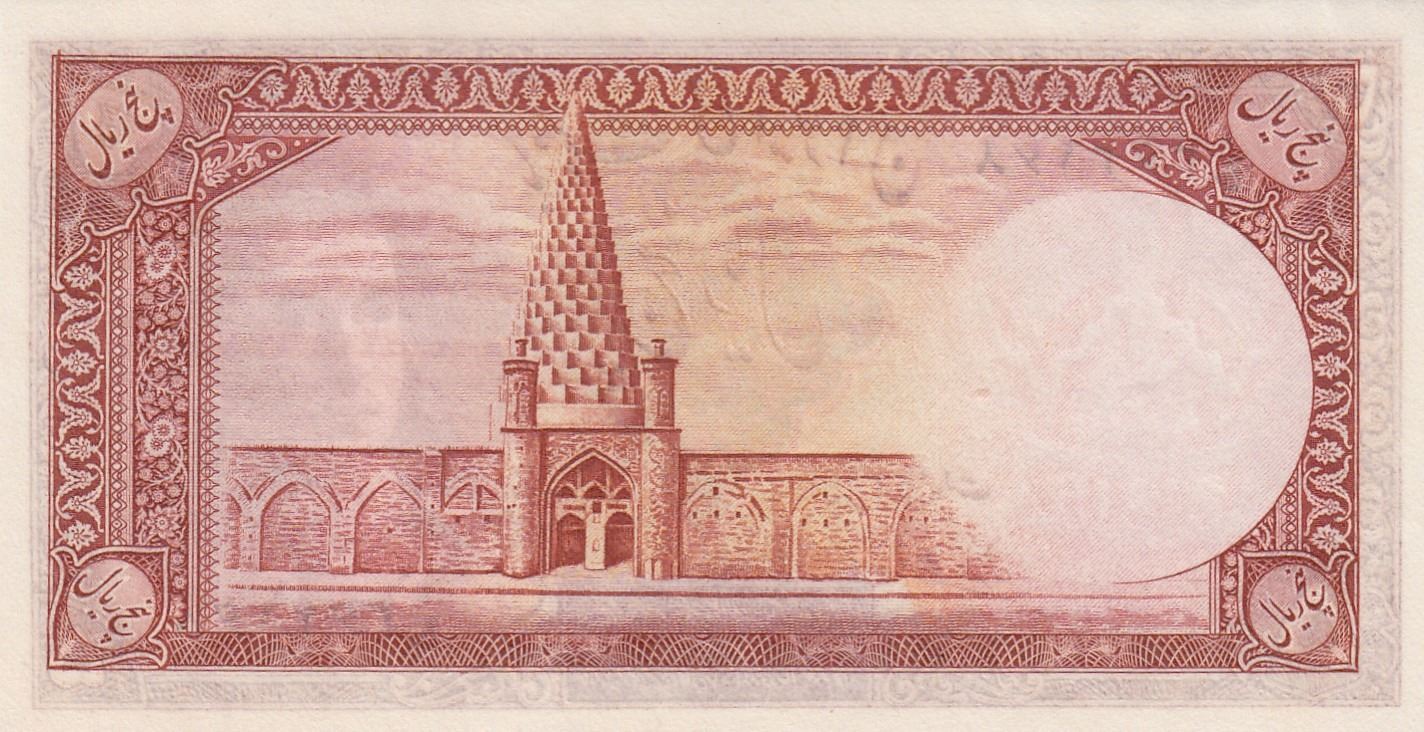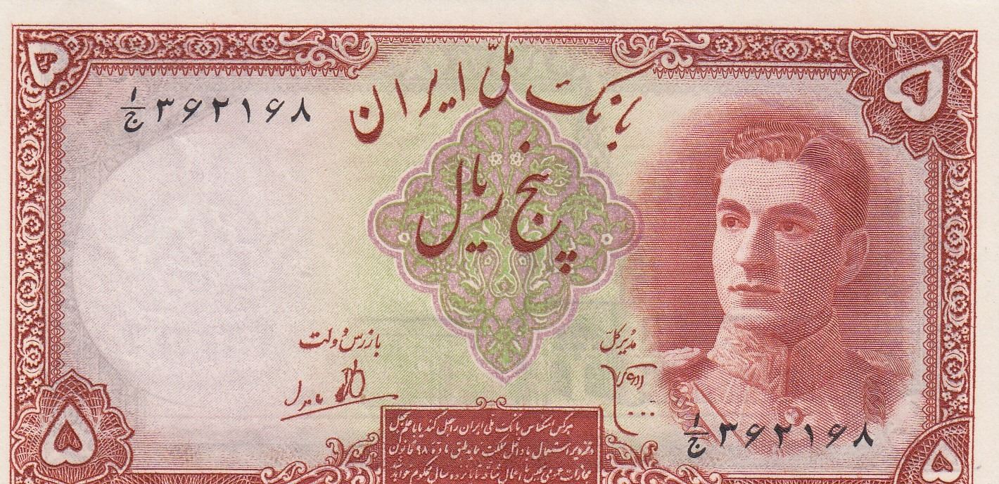 Iran, 5 Rials, 1944, AUNC, p39br/Shah Pahlavi portrait
