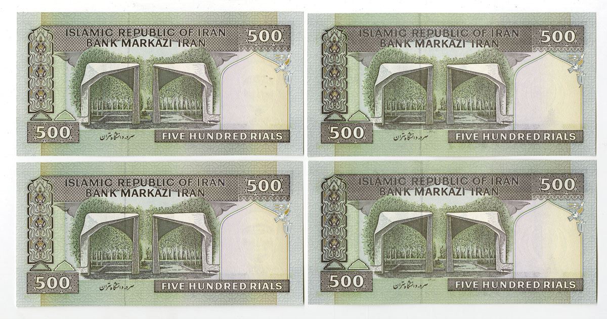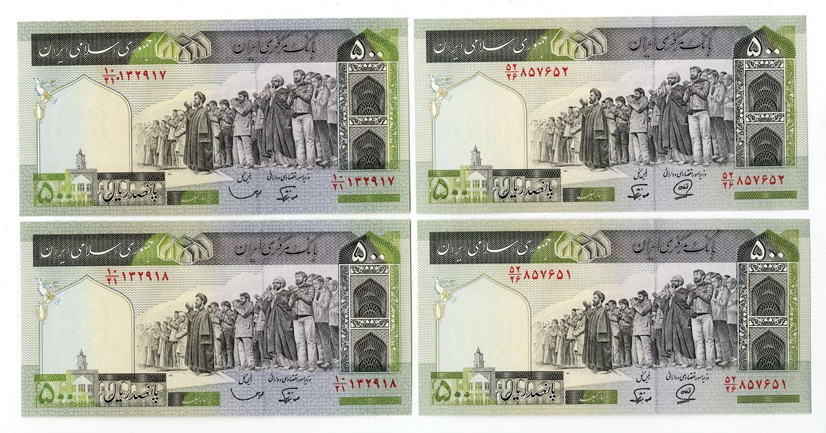 Iran....., ND (1982-2002). 500 Rials, P-137e (2) and P-137h (2), Issued Banknote Quartet, Gray and olive print with Feyzieh Madressa Seminary at lower left and large prayer gathering at center, Back shows Tehran University, Notes are UNC to Gem UNC condition. TDLR. (4). Sold "AS IS" no returns accepted.
