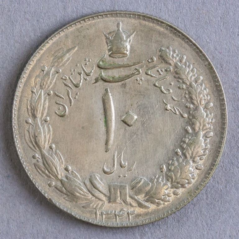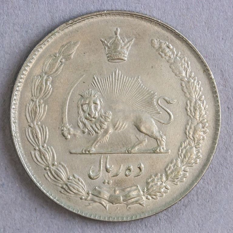 Iranian coin. Obverse: Value within crowned wreath. Lettering in Arabic. Reverse: Radiant lion holding sword within crowned wreath. Lettering in Arabic.