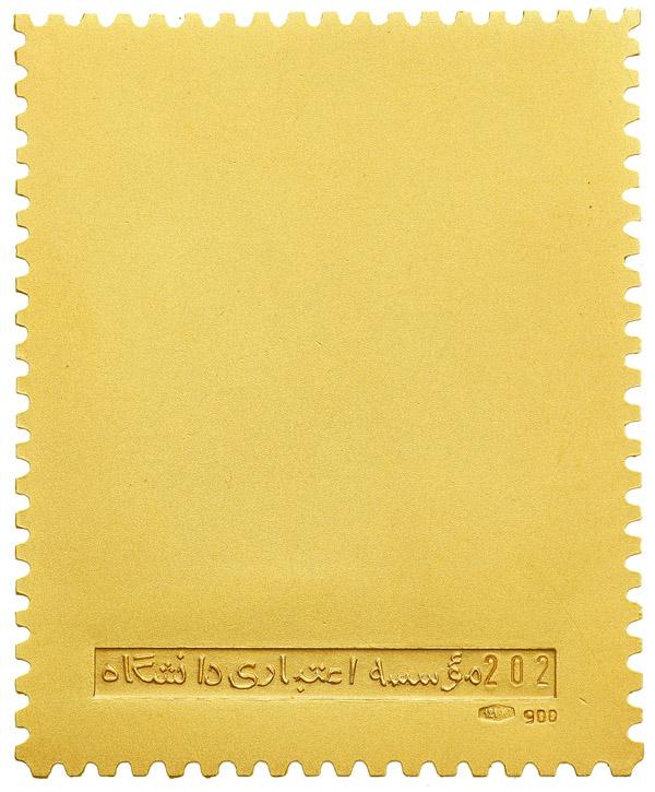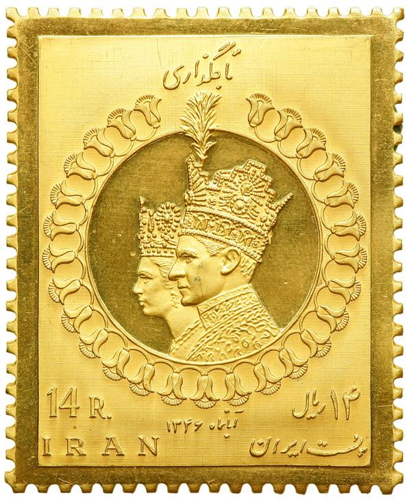 Iran. Gold 14 Rials Postage Stamp, SH.1347 (1967). 25.2 grams. 35.5 x 43.5 mm. Mohammad Reza Pahlevi. For the Coronation. Conjoined crowned bust left, within circular border and perforated edge. Reverse: Plain reverse with maker's name and 900 fine stamped. Brilliant Proof.
