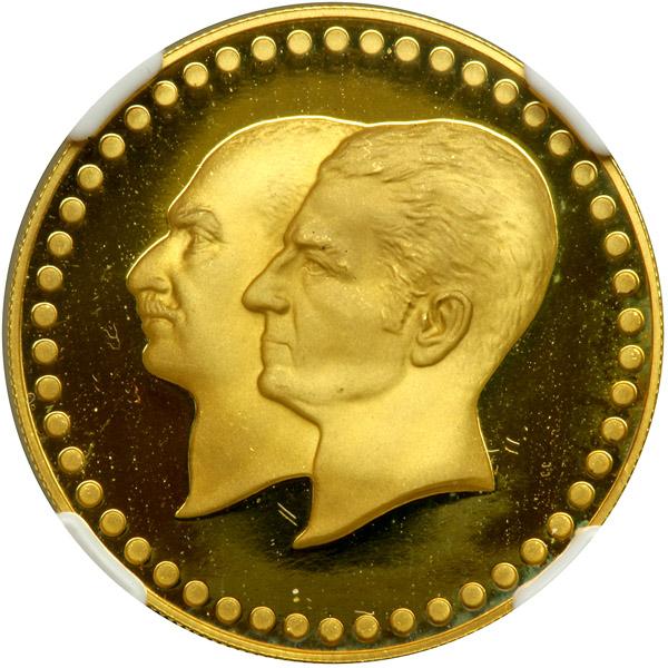 Iran. Gold Medal, MS2535 (1976). 10.01 grams. Stamped .900 fine. Bank Melli. 27 mm. Mohammad Reza Pahlevi. Struck for "Mother Day", Golden Jubilee of the National Bank of Iran. Conjoined bust of the Shah and his father. Reverse: Emblem over central bank building. NGC graded Proof 68 Ultra Cameo.