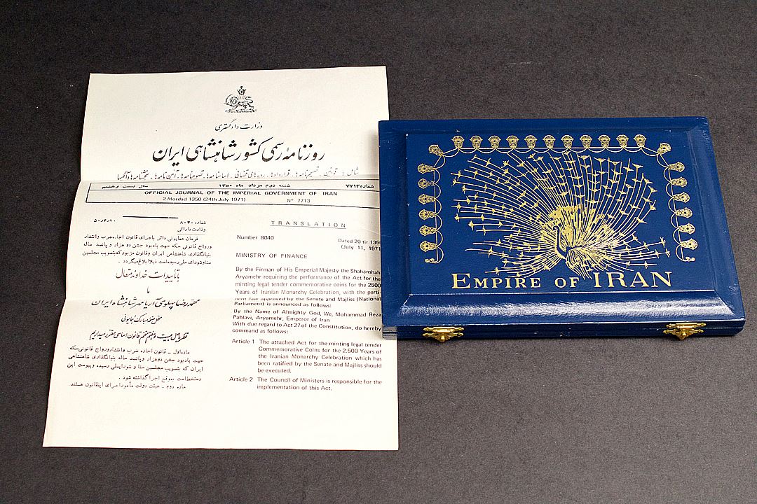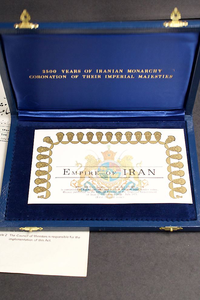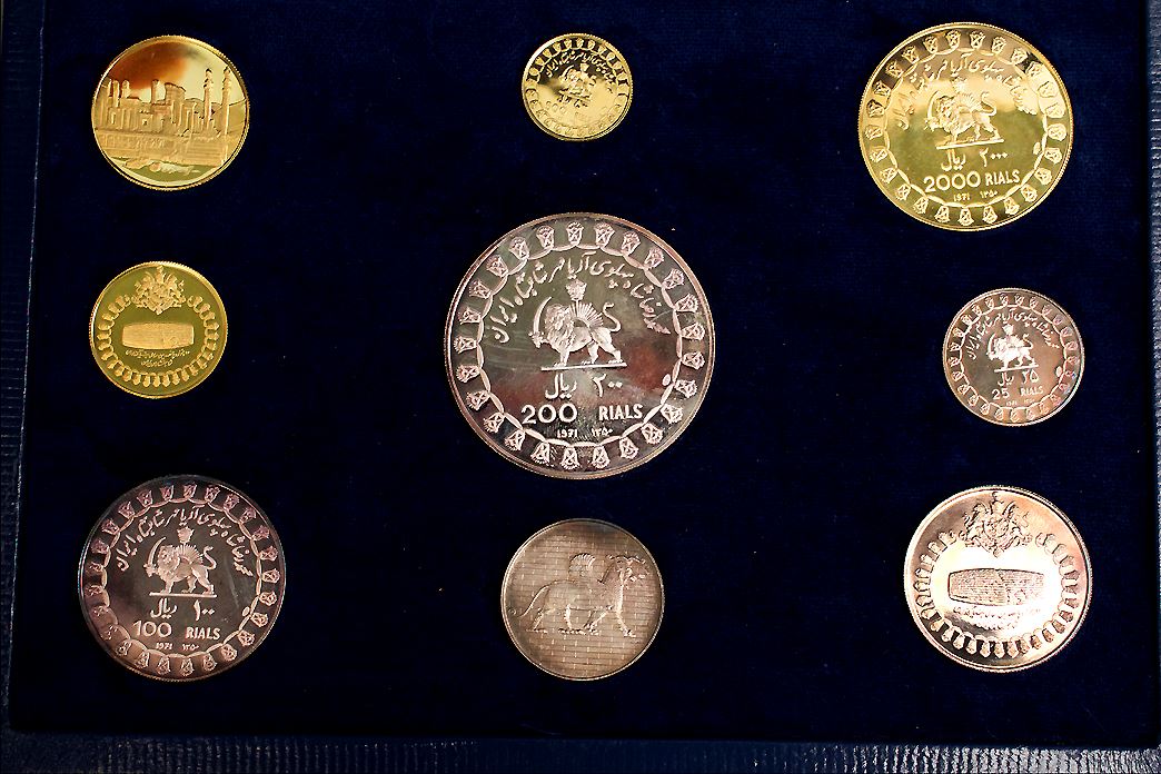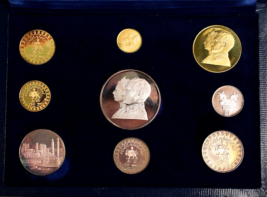 Iran, Empire, Complete 9 coin set, consisting of 4 gold and 5 silver coins, 1971, in case of issue, with COA. KM#1184-1192, as coins, PS-2 as set. Choice Proof, a couple of pieces with a light hairline or two. (Gold coins- 1.6021 oz. AGW; Silver- 4.3358 oz ASW) Please note: not legal to ship to United States from Canada.