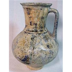Iran, Seljuk, Kashan, 12th - 13th Century. A blue and green painted under clear glaze pitcher with a single handle. Decoration consists of banded registers of linear patterns. Intact with glaze degradation. H: 17.5cm. $300 - $400
