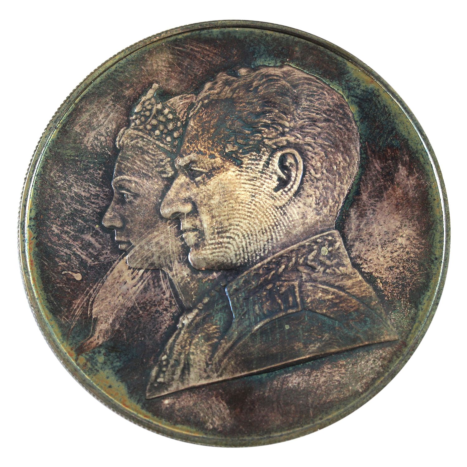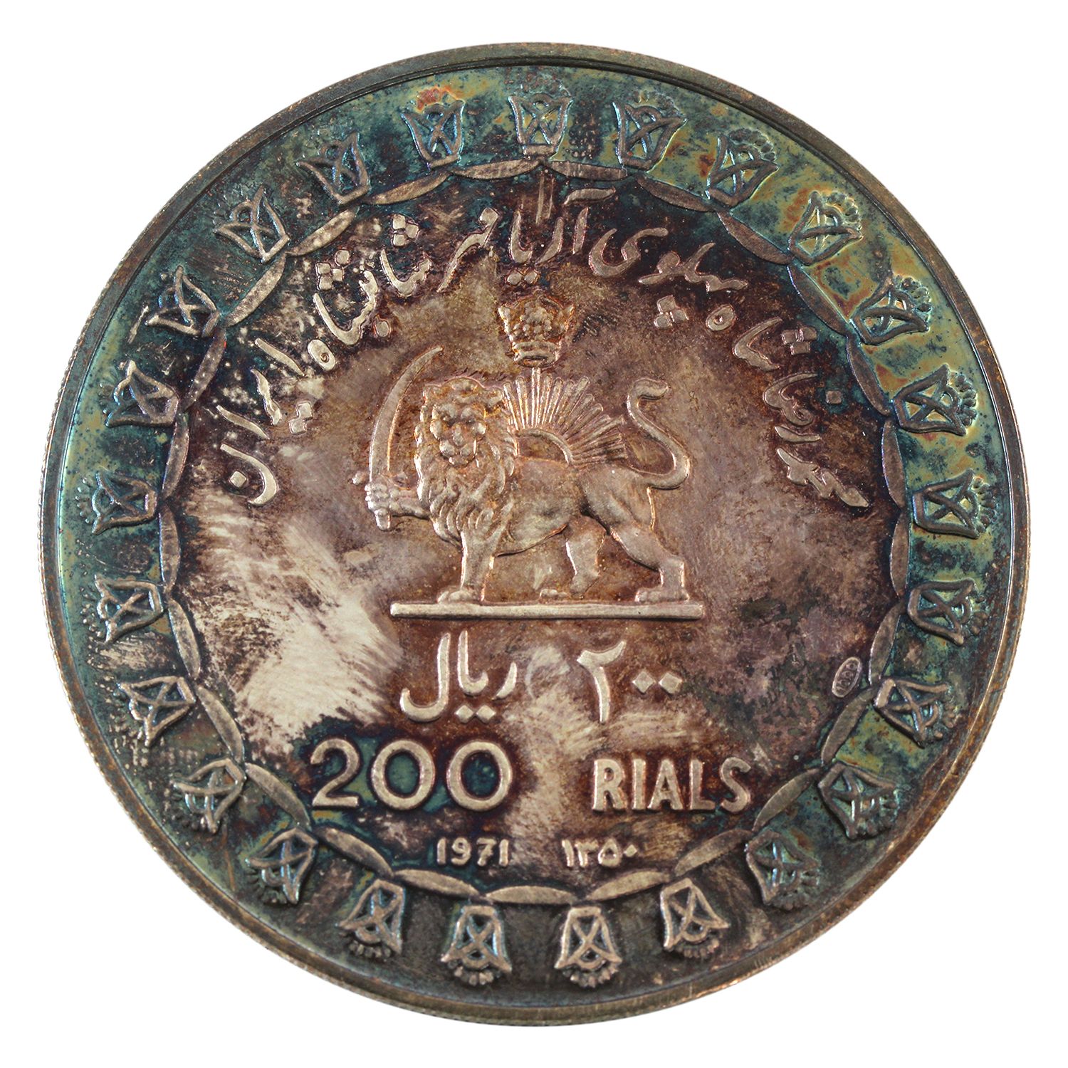 Coin is .999 fine and contains 1.927ozt pure. Rainbow toning with some handling marks (Tax Exempt)