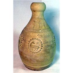 Iran, c.1920's. A charming tan hand burnished jug with bands of indentations and five medallions containing an ibex looking back at a plant. The inside is glazed for holding liquids. An intact and a very handsome piece. $75 - $100