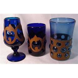 Iran, c.1976. Three cobalt glass blown into metal fretwork objects. A goblet and two glasses. Very lovely items once exhibited in Mashlad, Iran. $150 - $200/3