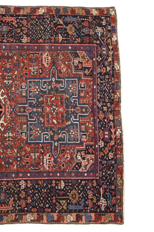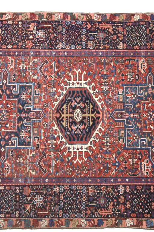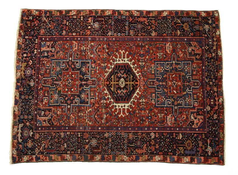 Featured in this lot is an Iranian East Azerbaijan Karadja pile carpet circa 1920s. The rug features a wonderfully and professionally crafted wool construction that shows a hand knotted design with natural dyes. The rug features a traditional Karadja regional design with geometric patterns and accents with a thick double bar border that shows geometric patterns throughout and a fringe on both sides of the rug. The House of Caradja, Karadja, Karaca, or Caragea (also known as Caratzas and Karatzas), was a princely house of Byzantine and Phanariote Greek origins, present as dignitaries in the Ottoman Empire, and established as boyars and hospodars in the Danubian Principalities from the late 16th century. The overall condition of this Iranian rug is good with no obvious signs of damage. The measurements of this Iranian rug are 71"L x 54"W.*